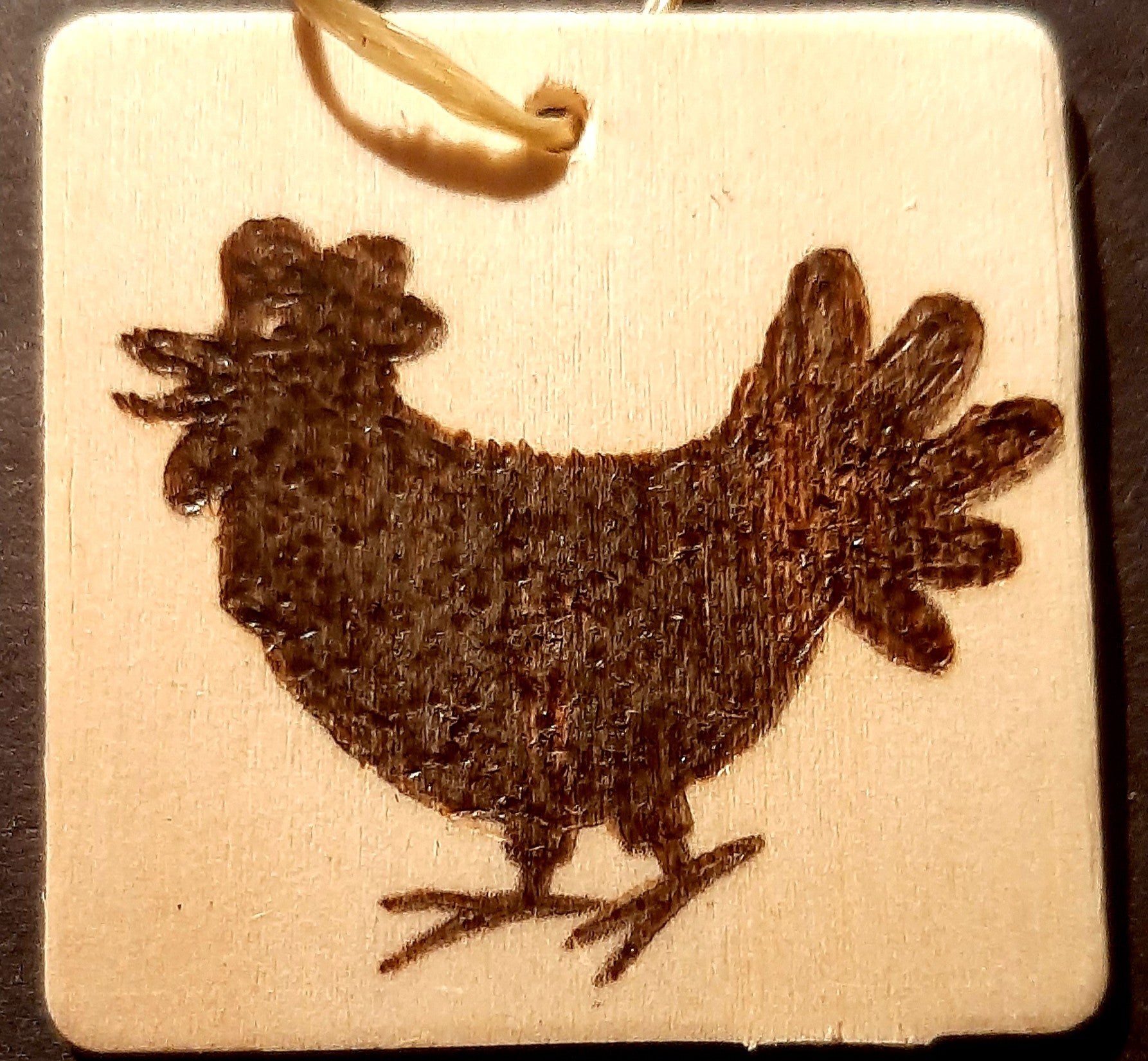 Kadolabel van hout, met daarop een afbeelding gebrand in het thema pasen.