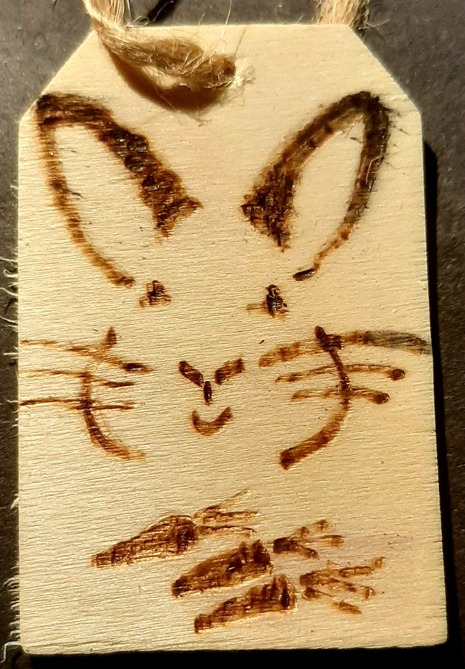 Kadolabel van hout, met daarop een afbeelding gebrand in het thema pasen.