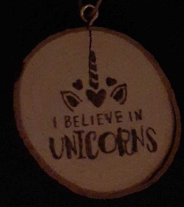 Kerstboomhanger gemaakt van een boomstamschijf, met aan de ene kant een afbeelding van een Unicorn en aan de andere kant een bijpassende tekst.