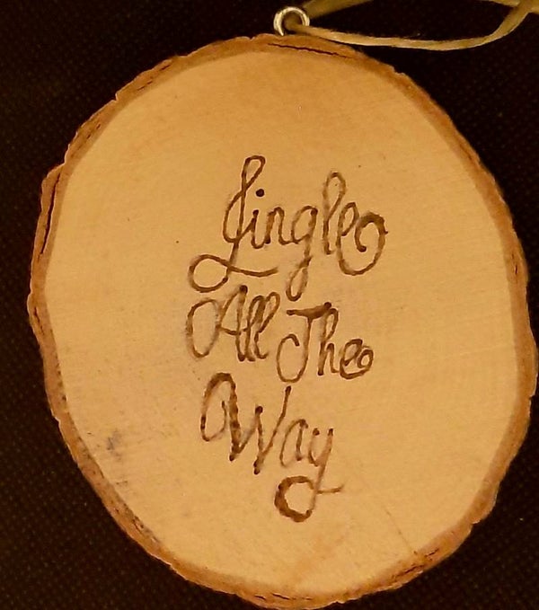 Kerstboomhanger gemaakt van een boomstamschijf, met daarop gebrand aan de ene kant een vintage afbeelding en aan de andere kant een bijpassende tekst.