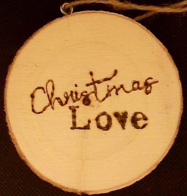 Kerstboomhanger gemaakt van een boomstamschijf, met daarop gebrand aan de ene kant een vintage afbeelding en aan de andere kant een bijpassende tekst.