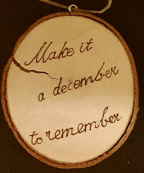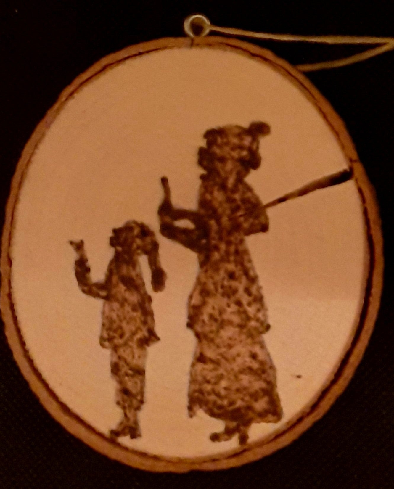 Kerstboomhanger gemaakt van een boomstamschijf, met daarop gebrand aan de ene kant een vintage afbeelding en aan de andere kant een bijpassende tekst.