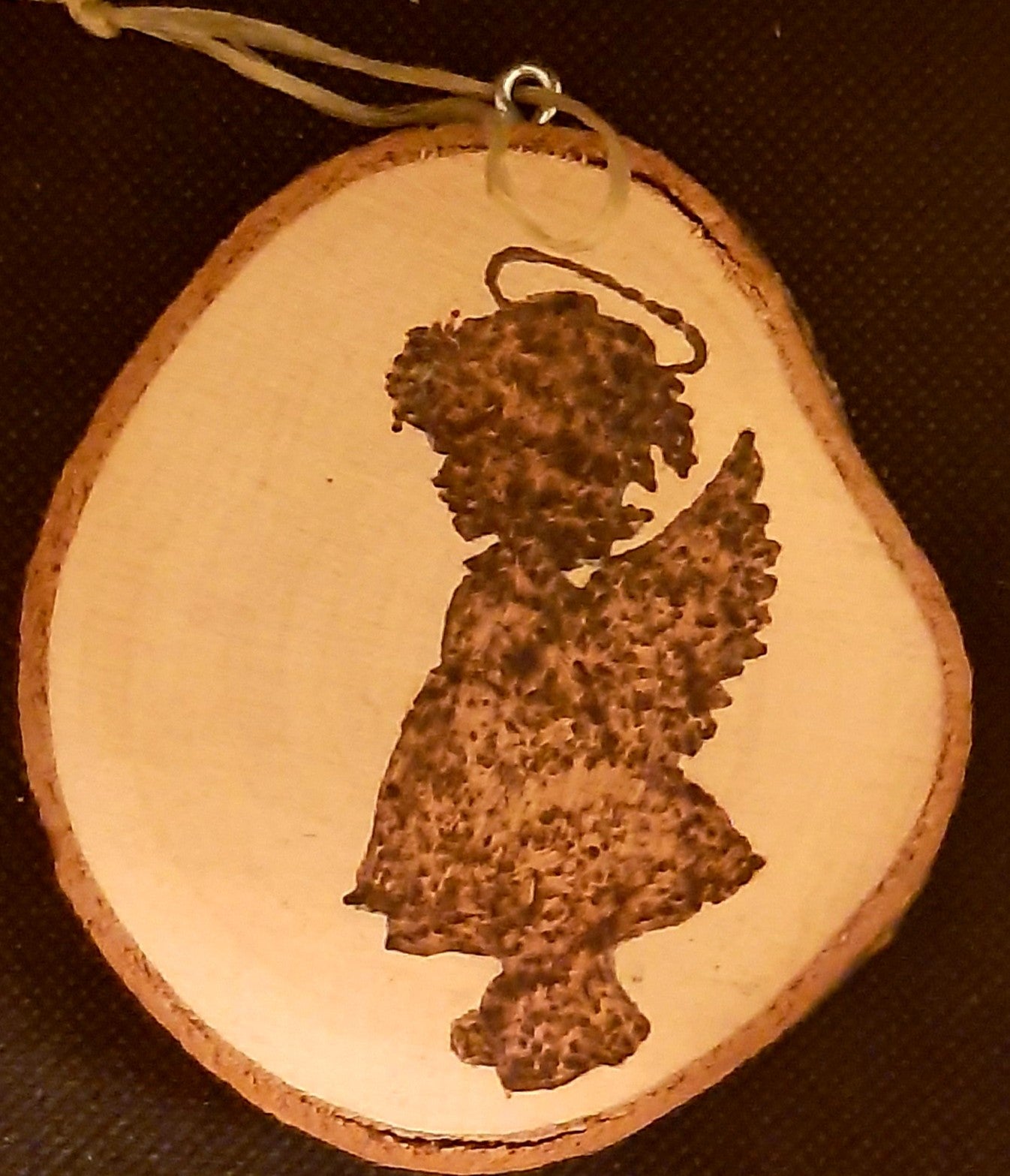 Kerstboomhanger gemaakt van een boomstamschijf, met daarop gebrand aan de ene kant een vintage afbeelding en aan de andere kant een bijpassende tekst.