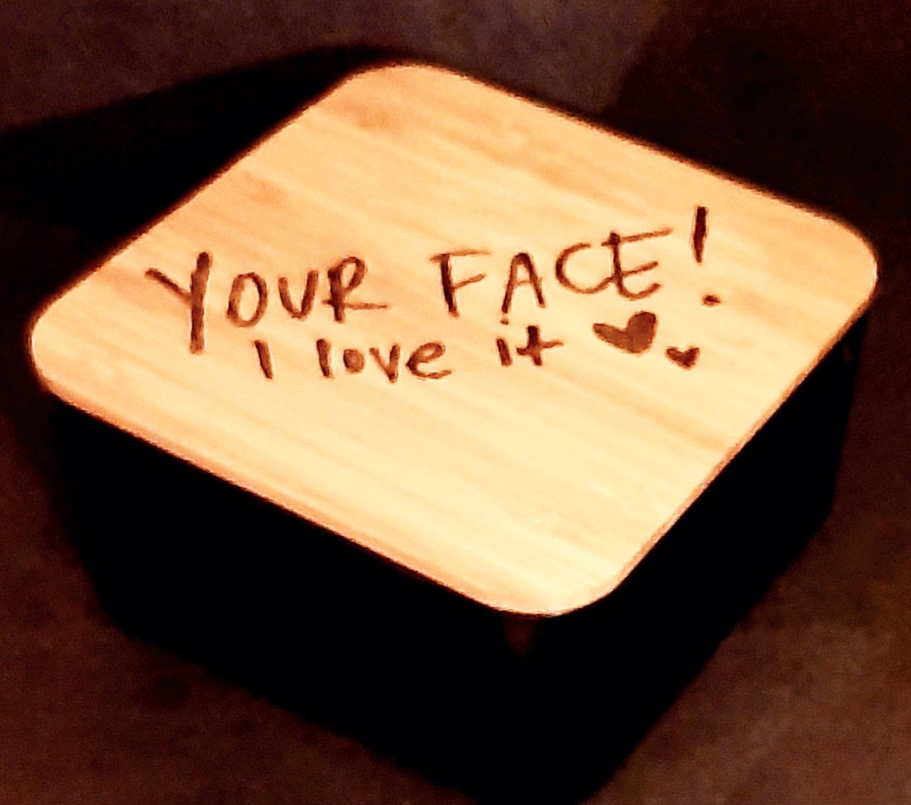 Kunststof kistje, met 3 opbergvakken, en een bamboehouten deksel, met daarop een toepasselijke tekst gebrand. Kleur van het kistje is zwart. In de deksel zit een spiegel, die je recht op in het kistje kunt plaatsen. Kistje is te gebruiken om bijvoorbeeld sieraden of make-up in op te bergen.