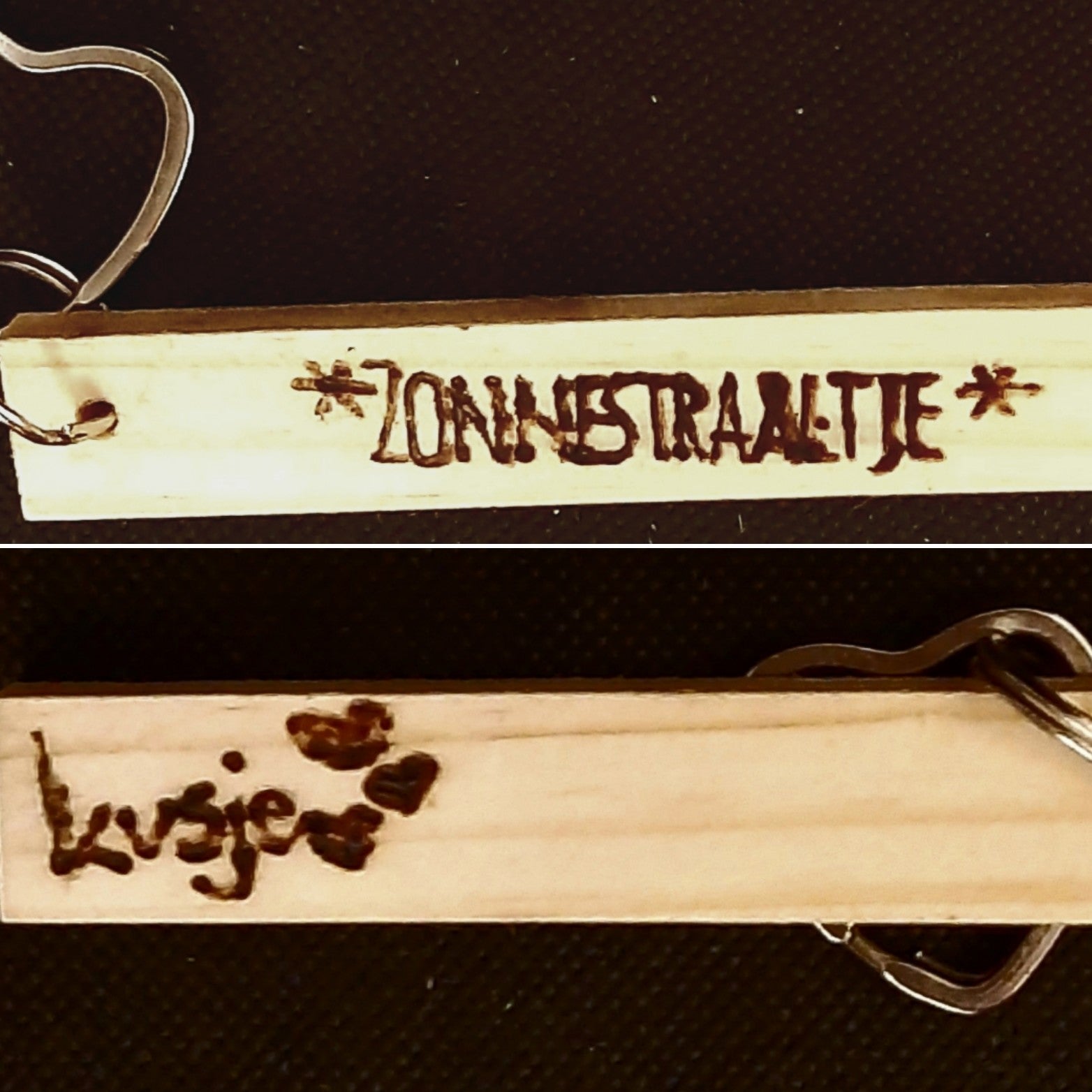 Sleutelhanger van hout met aan beide zijden een grappige en/of toepasselijke tekst gebrand.