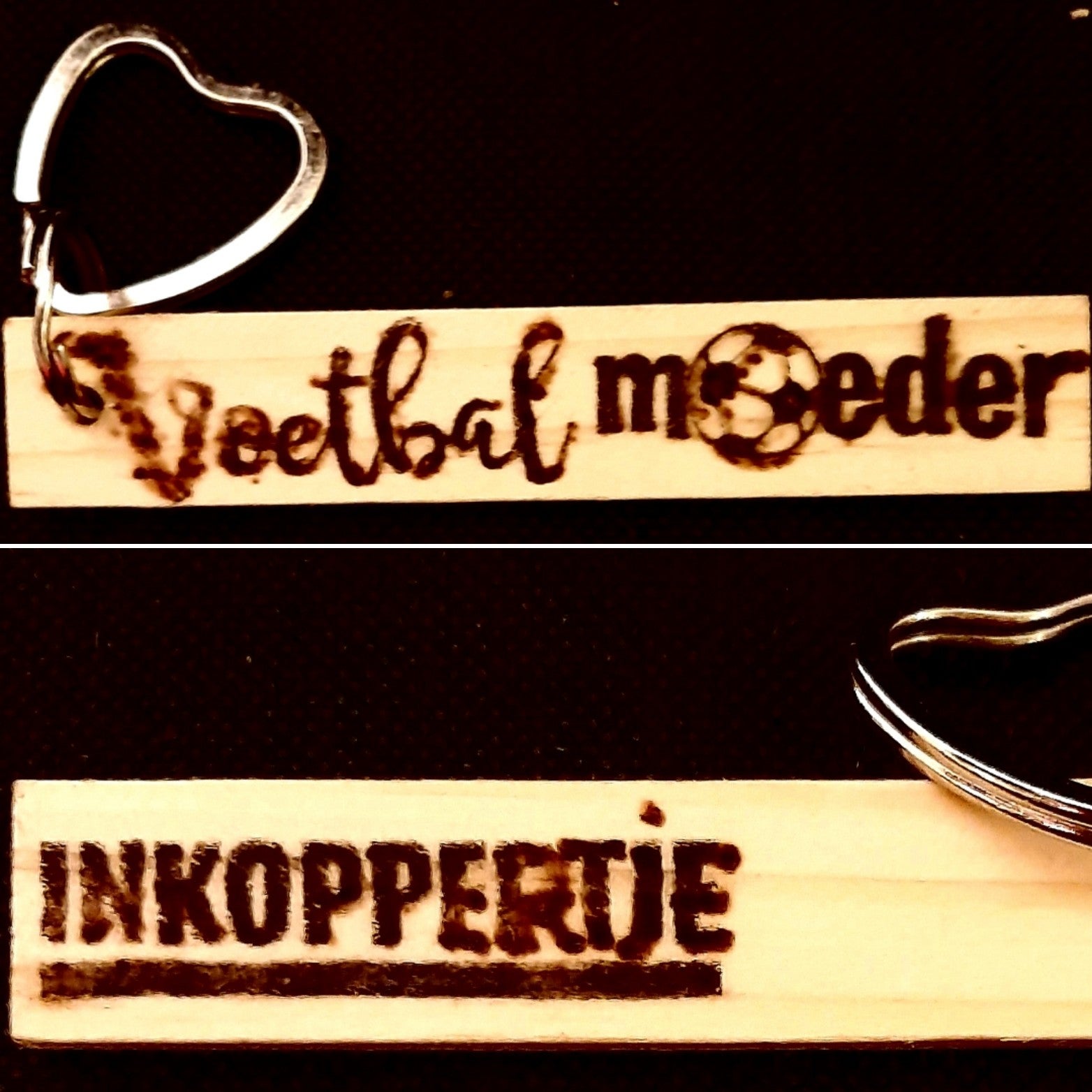 Sleutelhanger van hout met aan beide zijden een grappige en/of toepasselijke tekst gebrand.