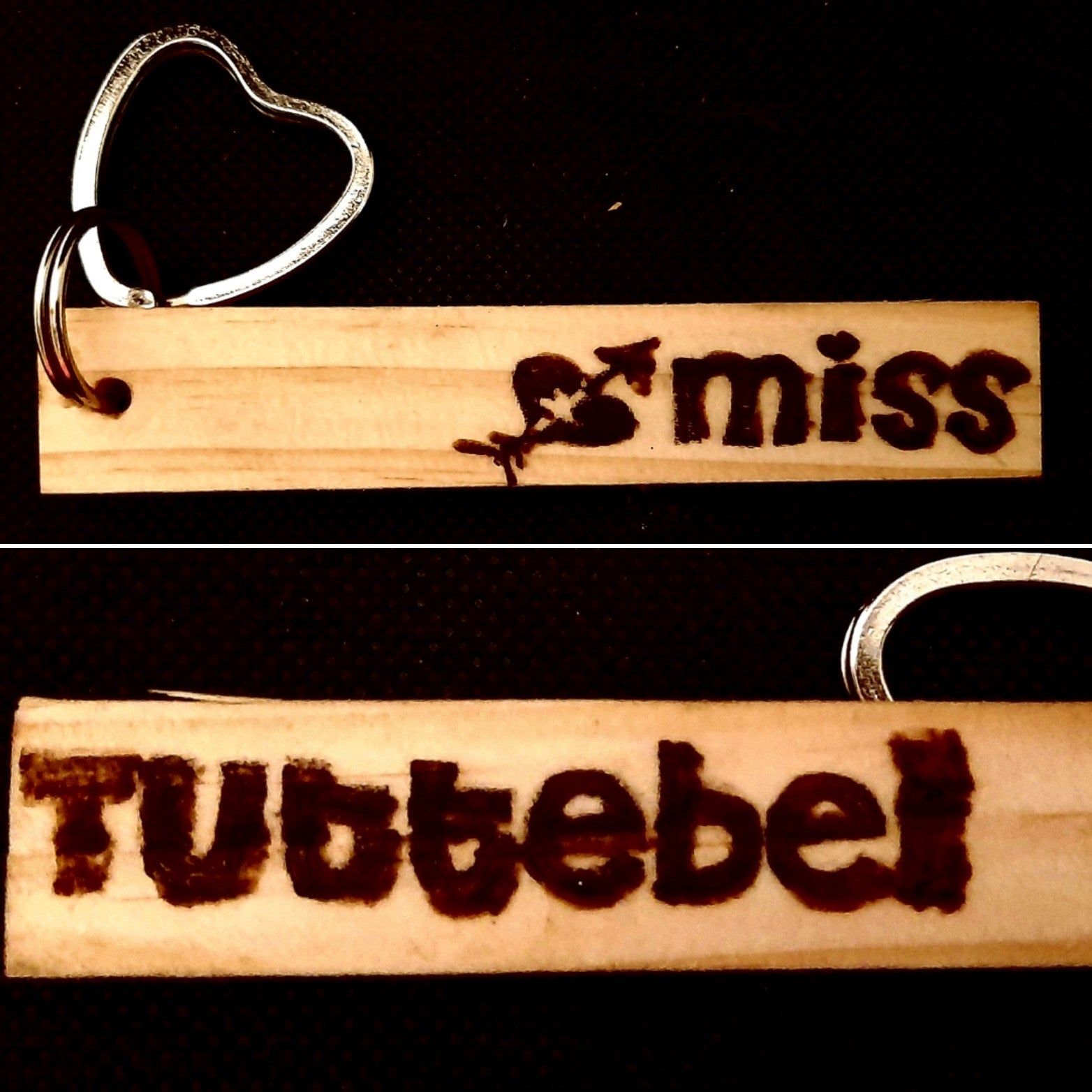 Sleutelhanger van hout met aan beide zijden een grappige en/of toepasselijke tekst gebrand.