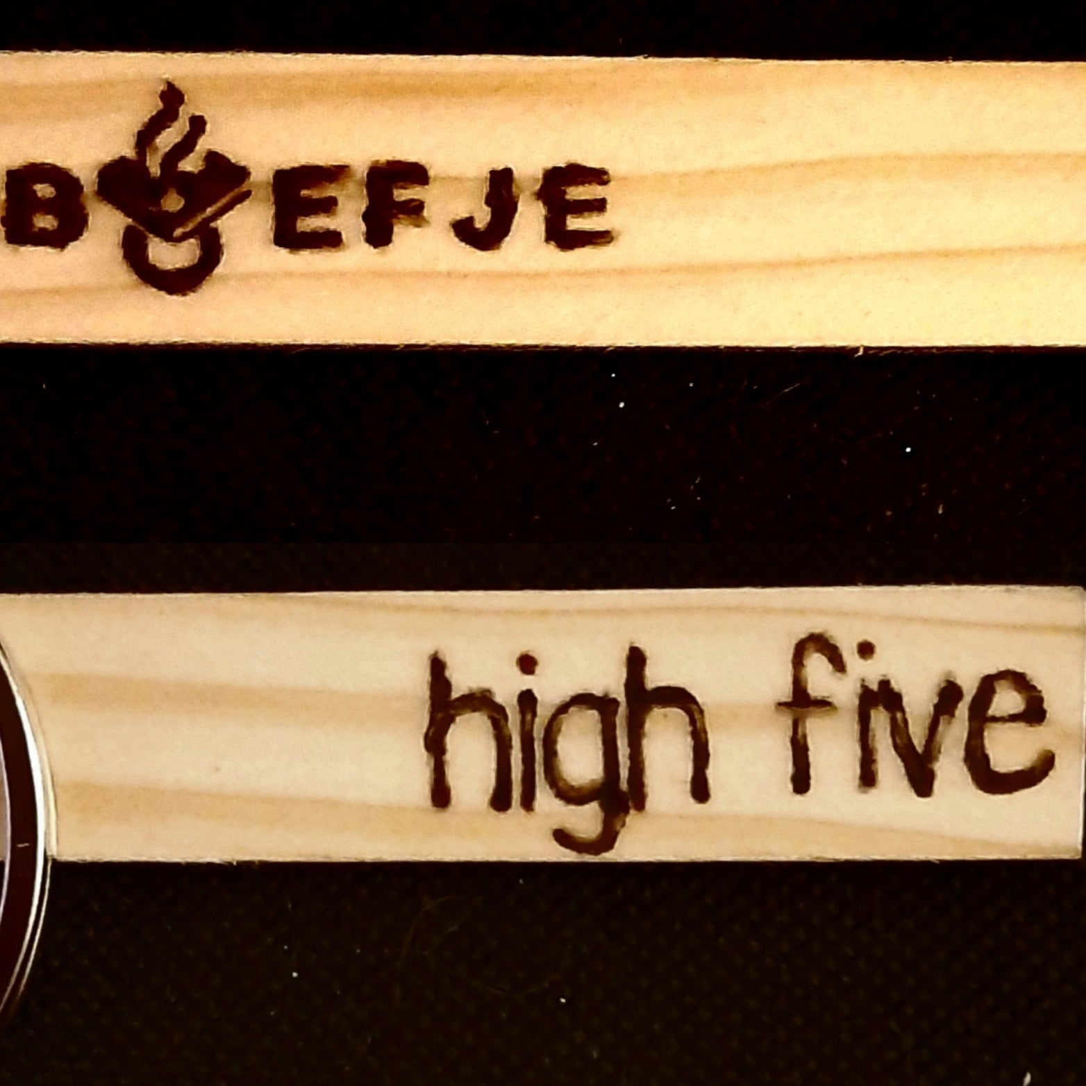 Sleutelhanger van hout met aan beide zijden een grappige en/of toepasselijke tekst gebrand.