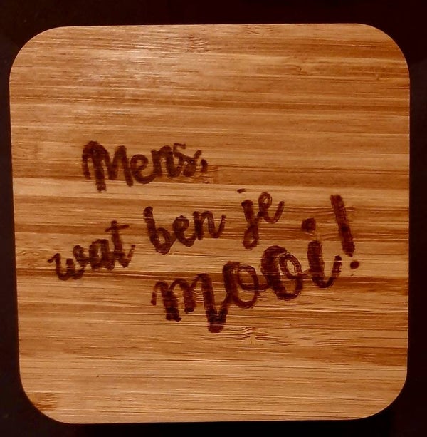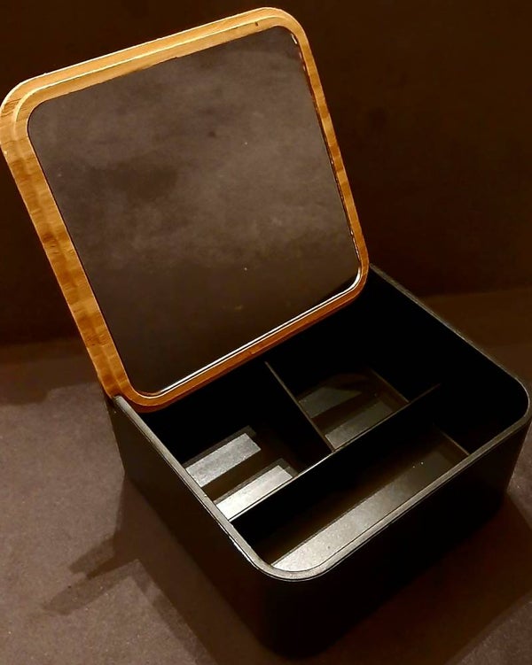 Kunststof kistje, met 3 opbergvakken, en een bamboehouten deksel, met daarop een toepasselijke tekst gebrand. Kleur van het kistje is zwart. In de deksel zit een spiegel, die je recht op in het kistje kunt plaatsen. Kistje is te gebruiken om bijvoorbeeld sieraden of make-up in op te bergen.