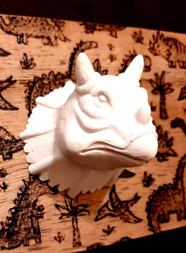 Kapstok van hout met daarop een kinderpatroon gebrand. De drie haken zijn drie dinokoppen, twee blauwe en één witte.