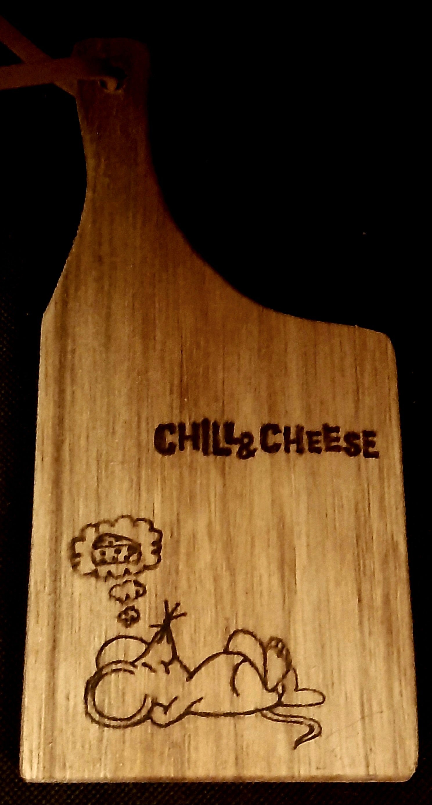 Snij-/serveerplankje van hout met daarop een toepasselijke tekst en afbeelding gebrand.
