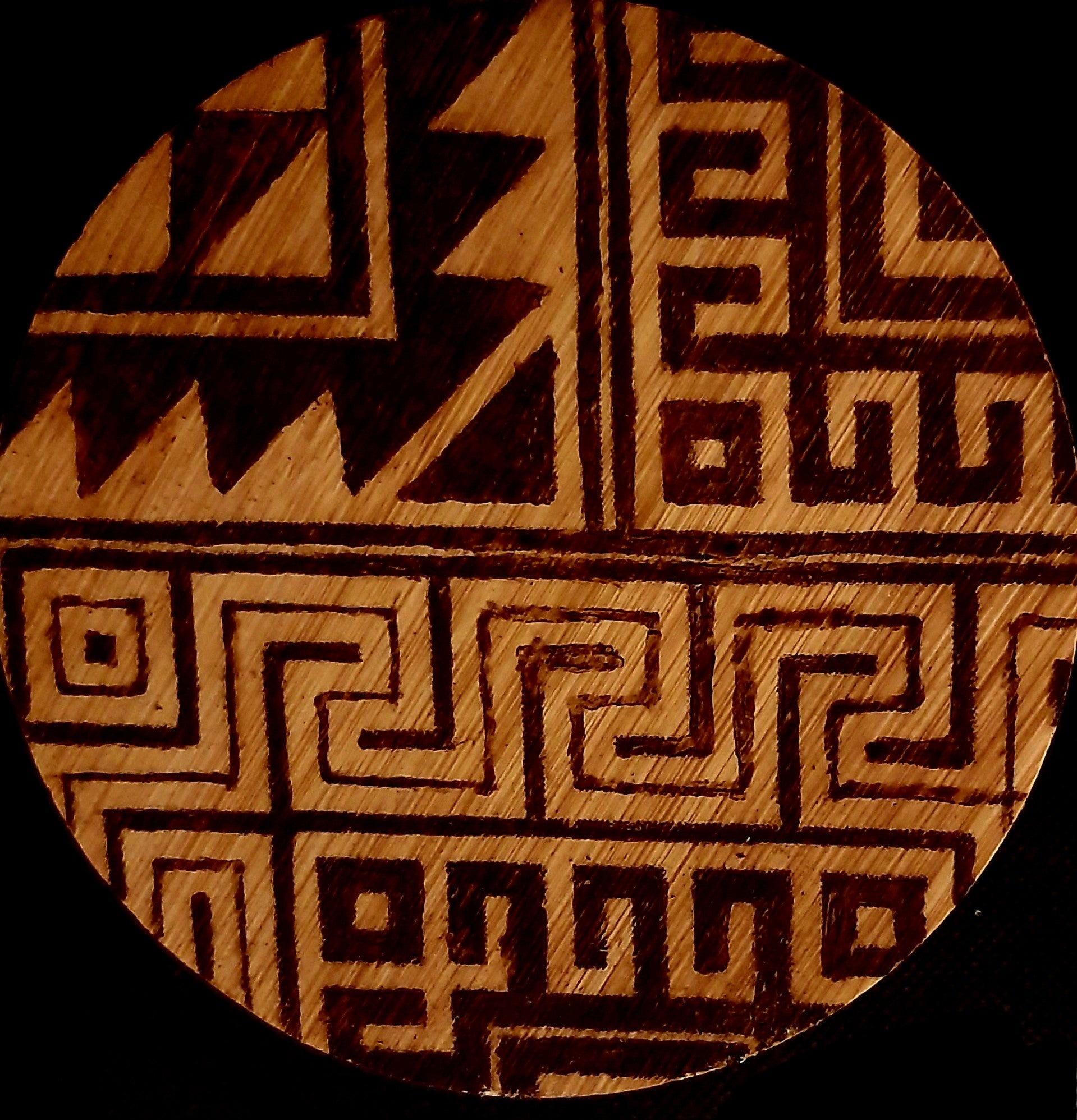 Keramieken voorraadpot  met een deksel van hout, waarop een grafisch patroon is gebrand.