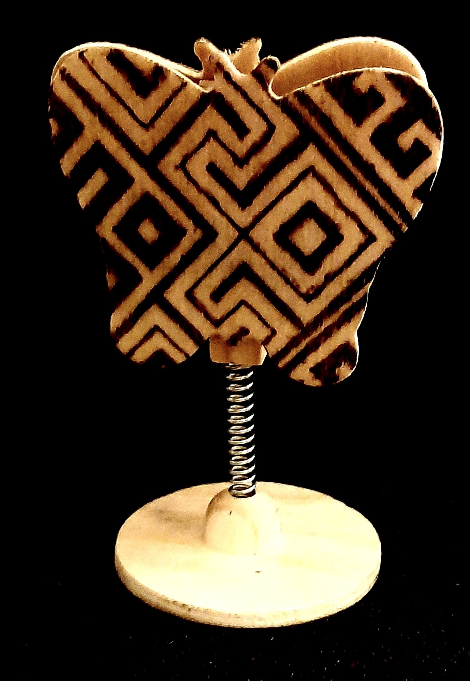 Foto-/memoklem van hout, in de vorm van een vlinder, met daarop een grafisch patroon gebrand.