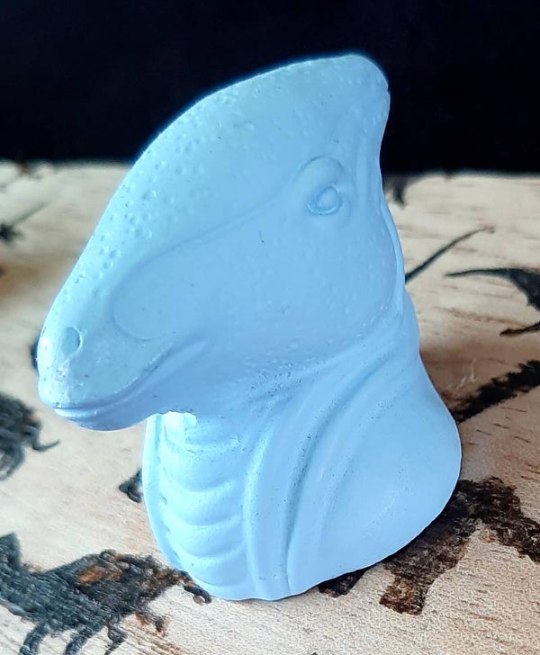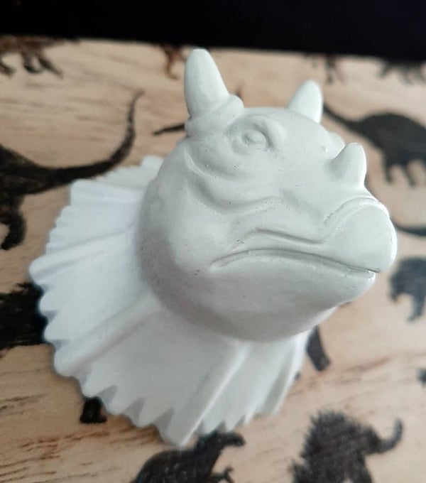 Kapstok van hout met daarop een kinderpatroon gebrand. De drie haken zijn drie dinokoppen, twee blauwe en één witte.