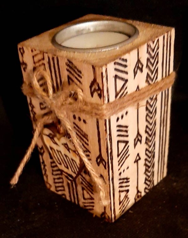 Gezellige waxinelichtjes houder van hout, met daarop een grafisch patroon gebrand. Hij wordt inclusief kaarsje geleverd.