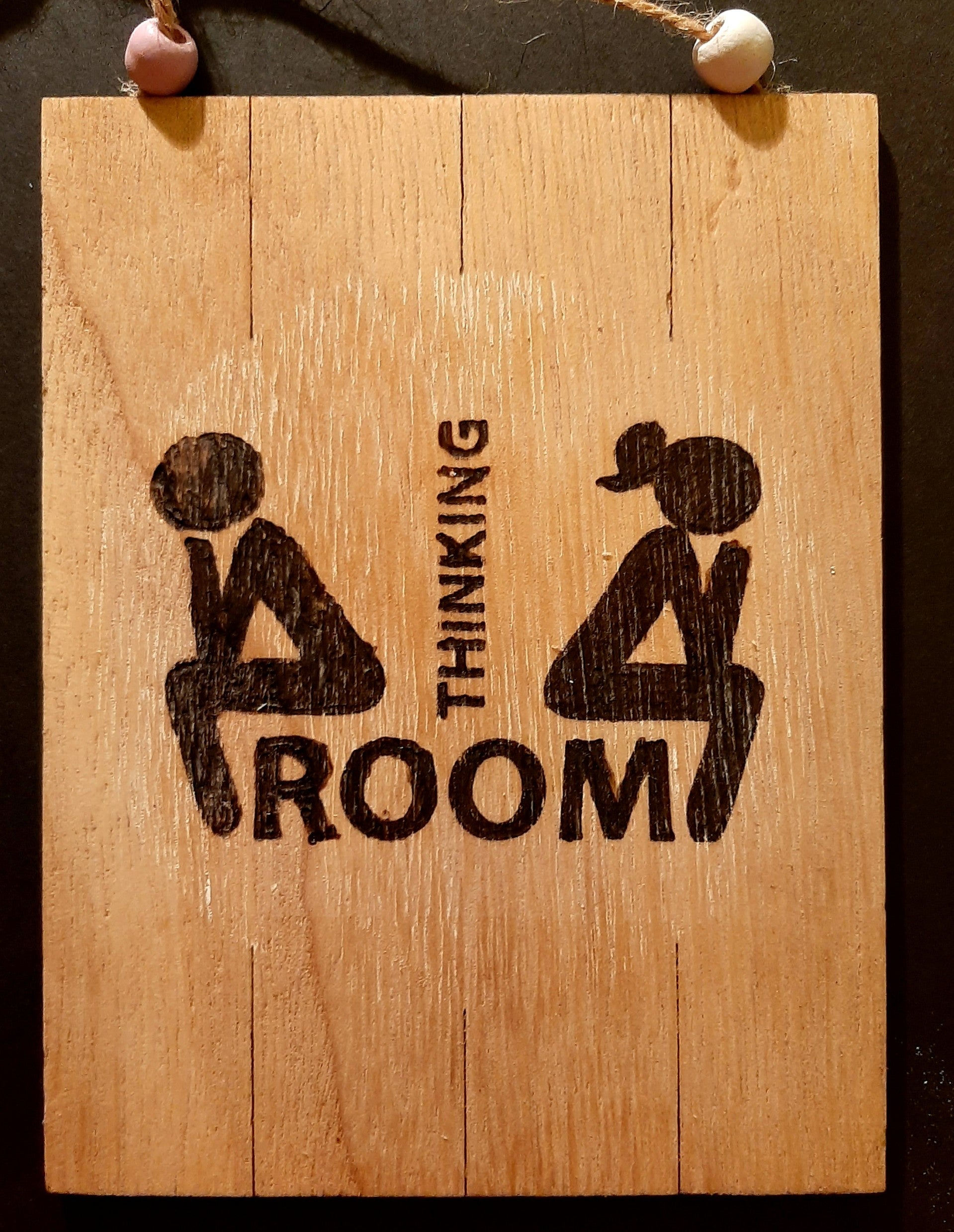 Grappig wc-bordje van hout met daarop een grappige toepasselijke tekst gebrand. Het bordje is voorzien van een ophangtouwtje.