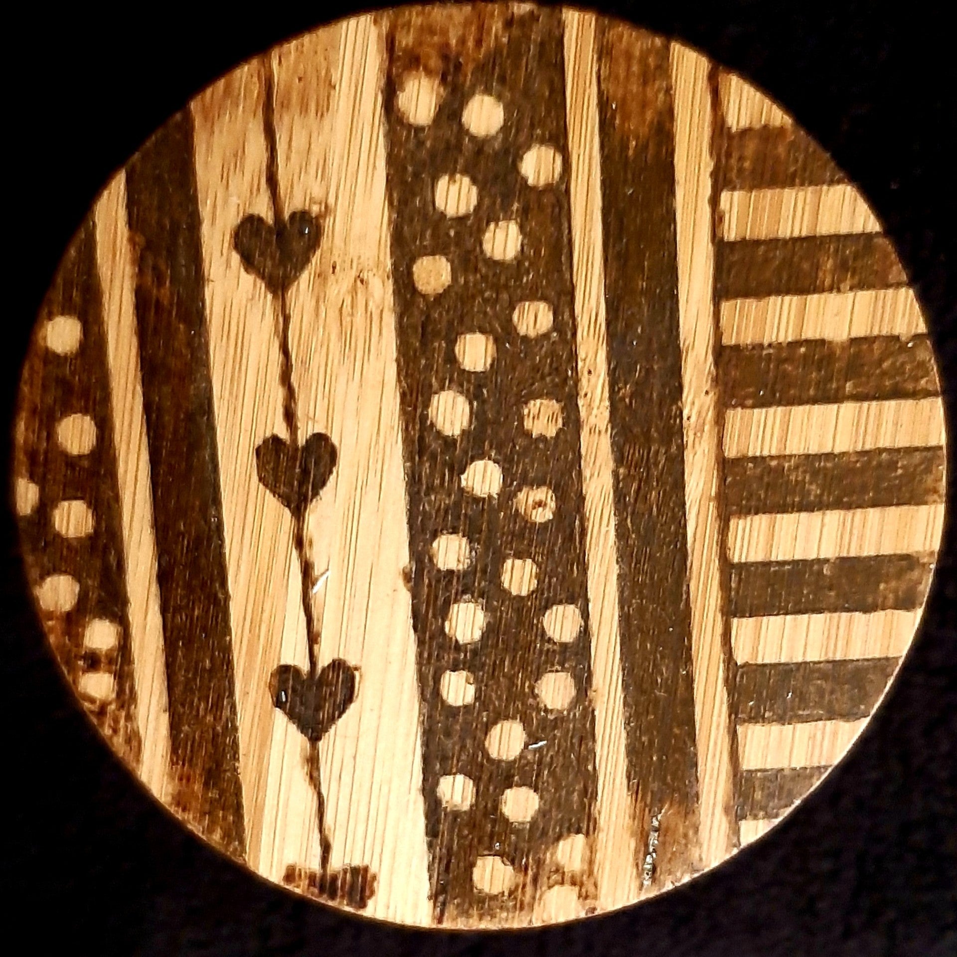 Keramieken voorraadpot met een deksel van bamboehout, waarop een grafisch patroon is gebrand. De kleur van de keramieken pot is zachtblauw.