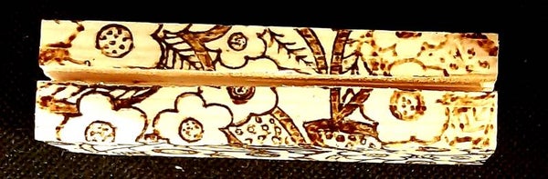 Foto-/kaartenhouder van hout met daarop een bloemenpatroon gebrand.