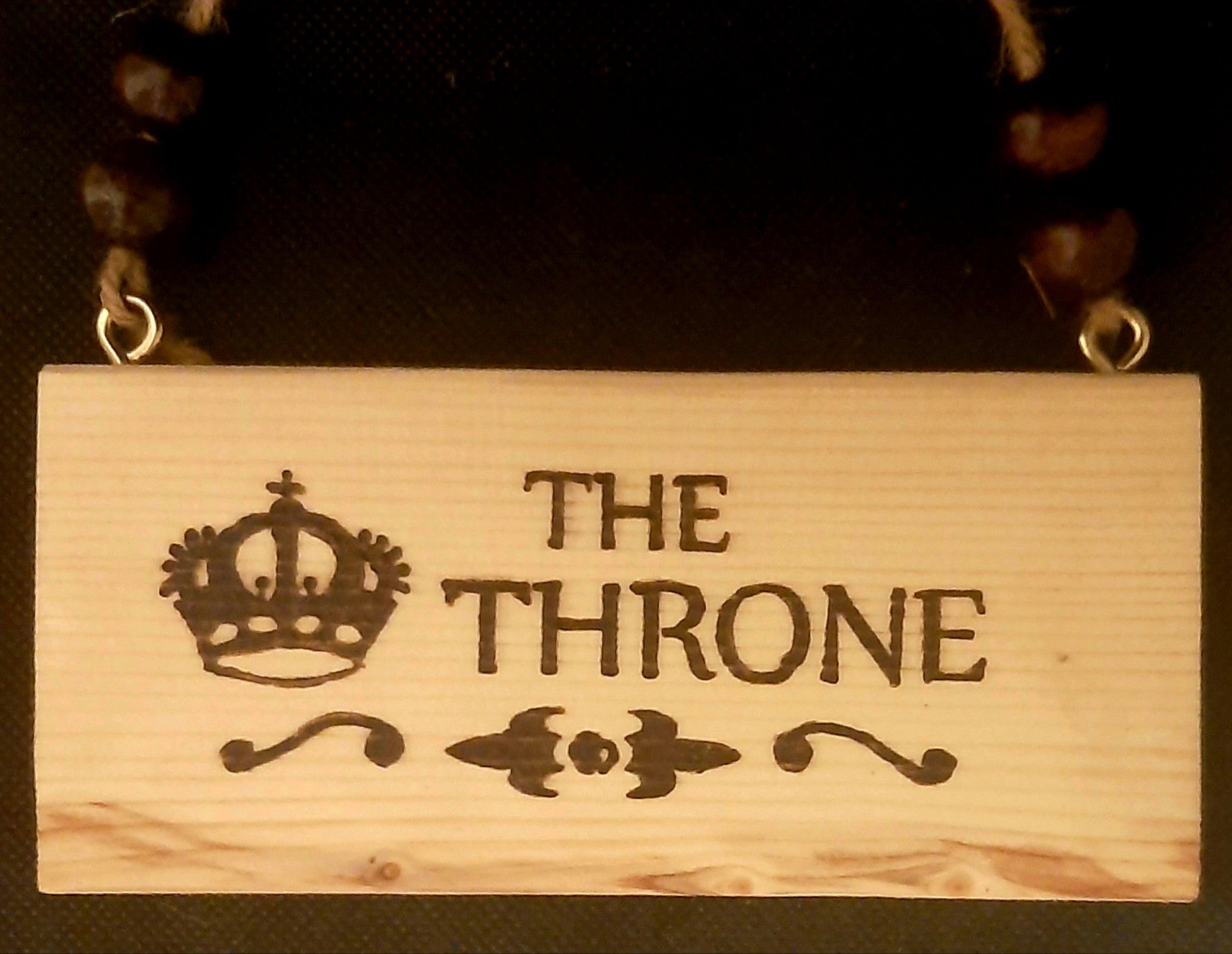 Grappig wc-bordje van hout met daarop een grappige toepasselijke afbeelding en/of tekst gebrand. Het bordje is voorzien van een ophangtouwtje