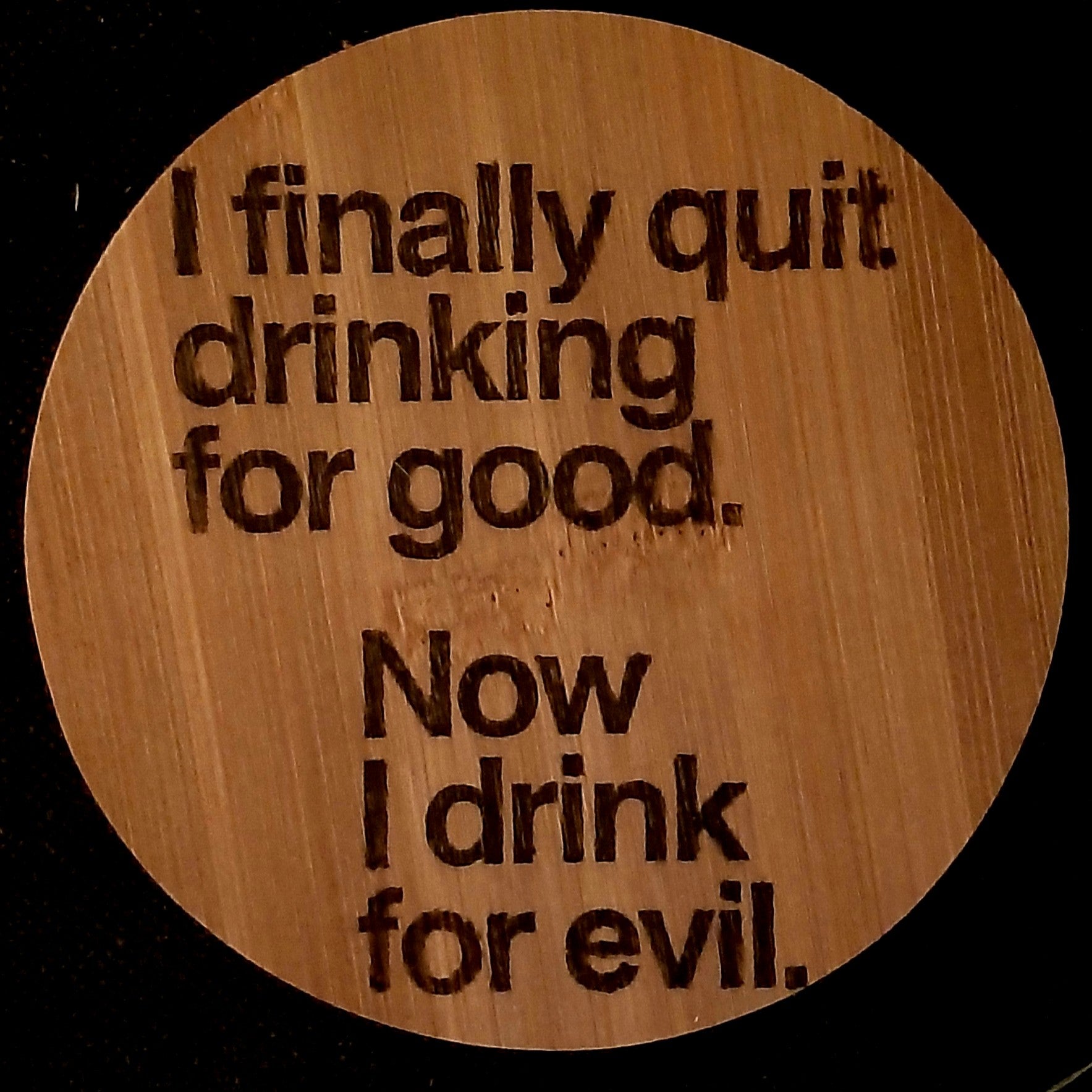 Onderzetter van bamboehout, met daarop een grappige bijpassende tekst en/of afbeelding gebrand.