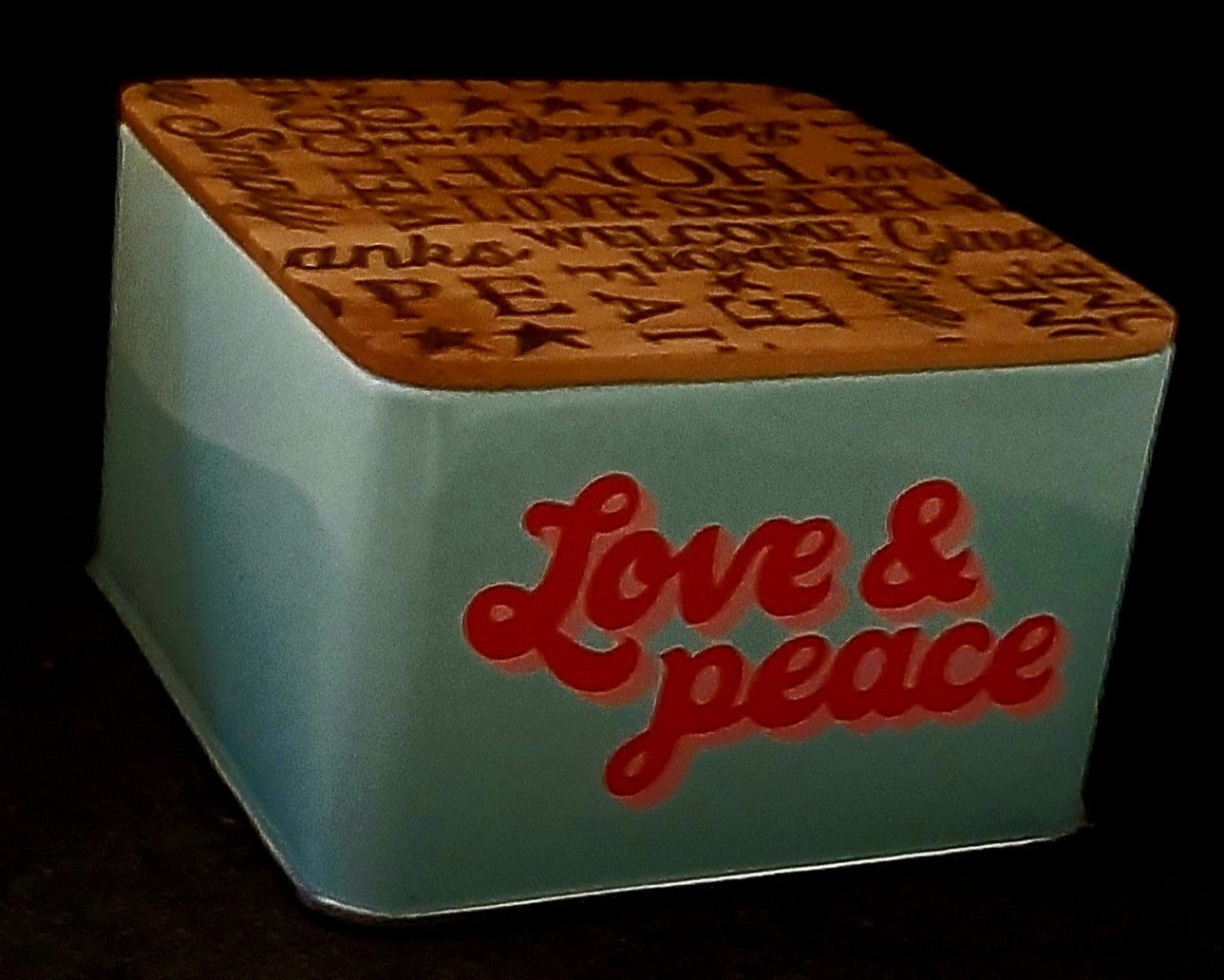 Leuk metalen blikje met een losse bamboehouten deksel. Op de deksel is een grafisch patroon gebrand.