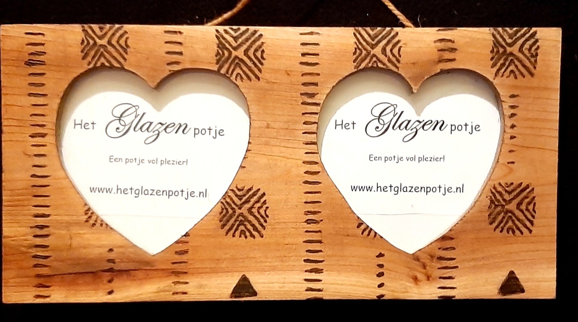 Mooie fotolijst voor twee foto's, waarop een grafisch patroon gebrand is. Aan de lijst is een ophangtouwtje bevestigd.
