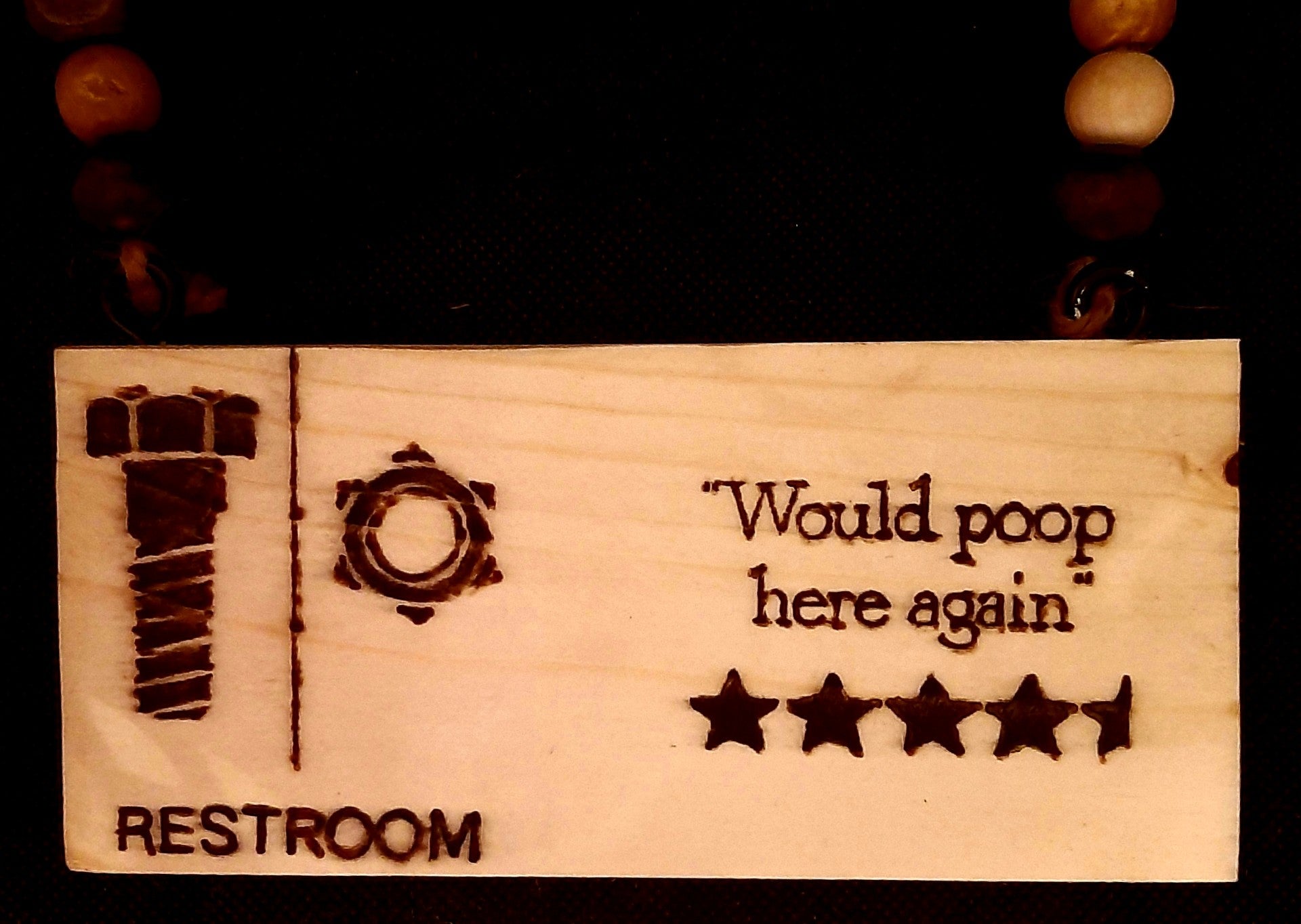Grappig wc-bordje van hout met daarop een grappige toepasselijke afbeelding en/of tekst gebrand. Het bordje is voorzien van een ophangtouwtje