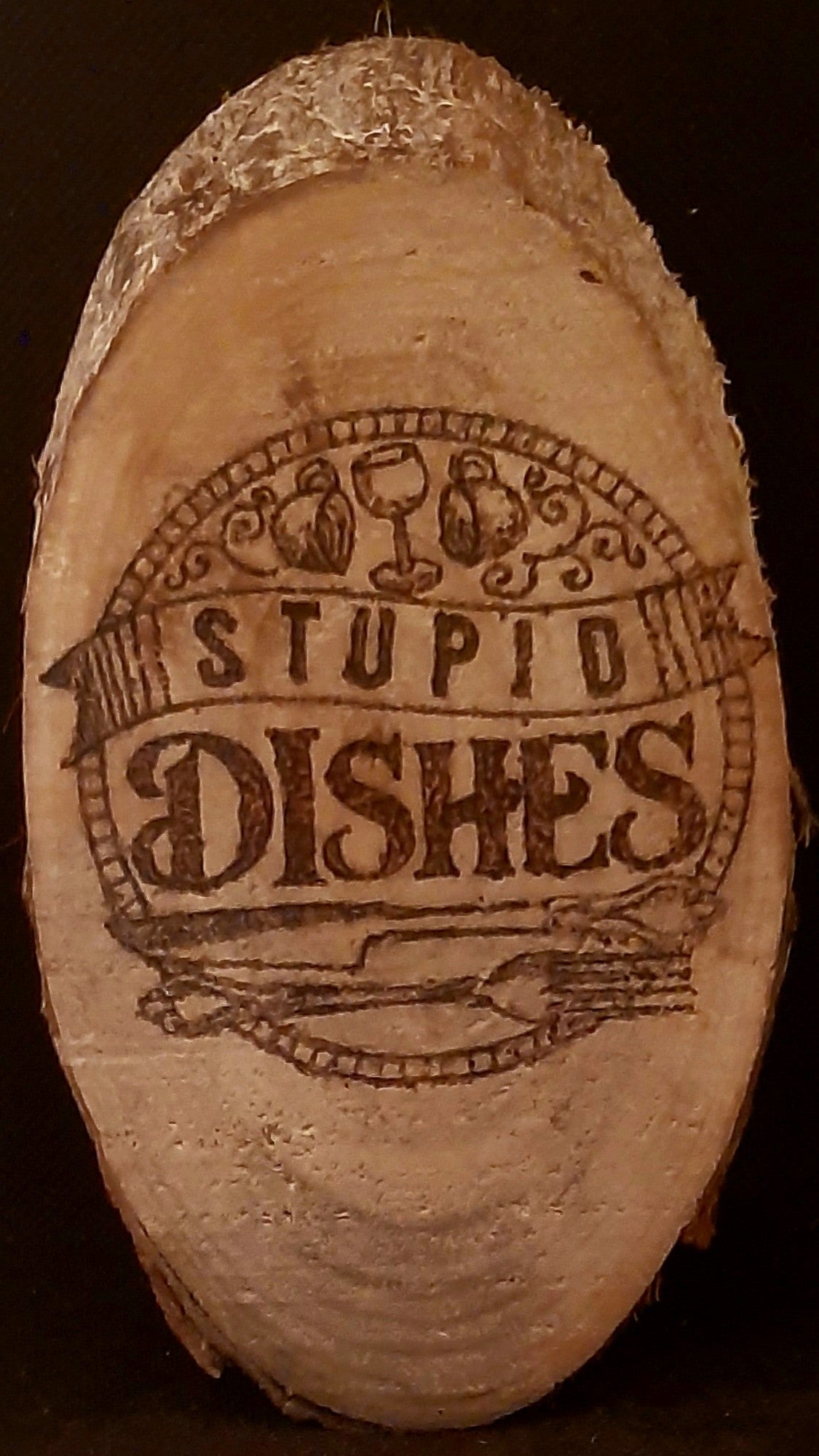 Tekstbordje gemaakt van een boomstamschijf, waar een toepasselijke tekst is op gebrand. De teksten gaan over voeding of de keuken. Aan de achterzijde is een ophanghaakje bevestigd.