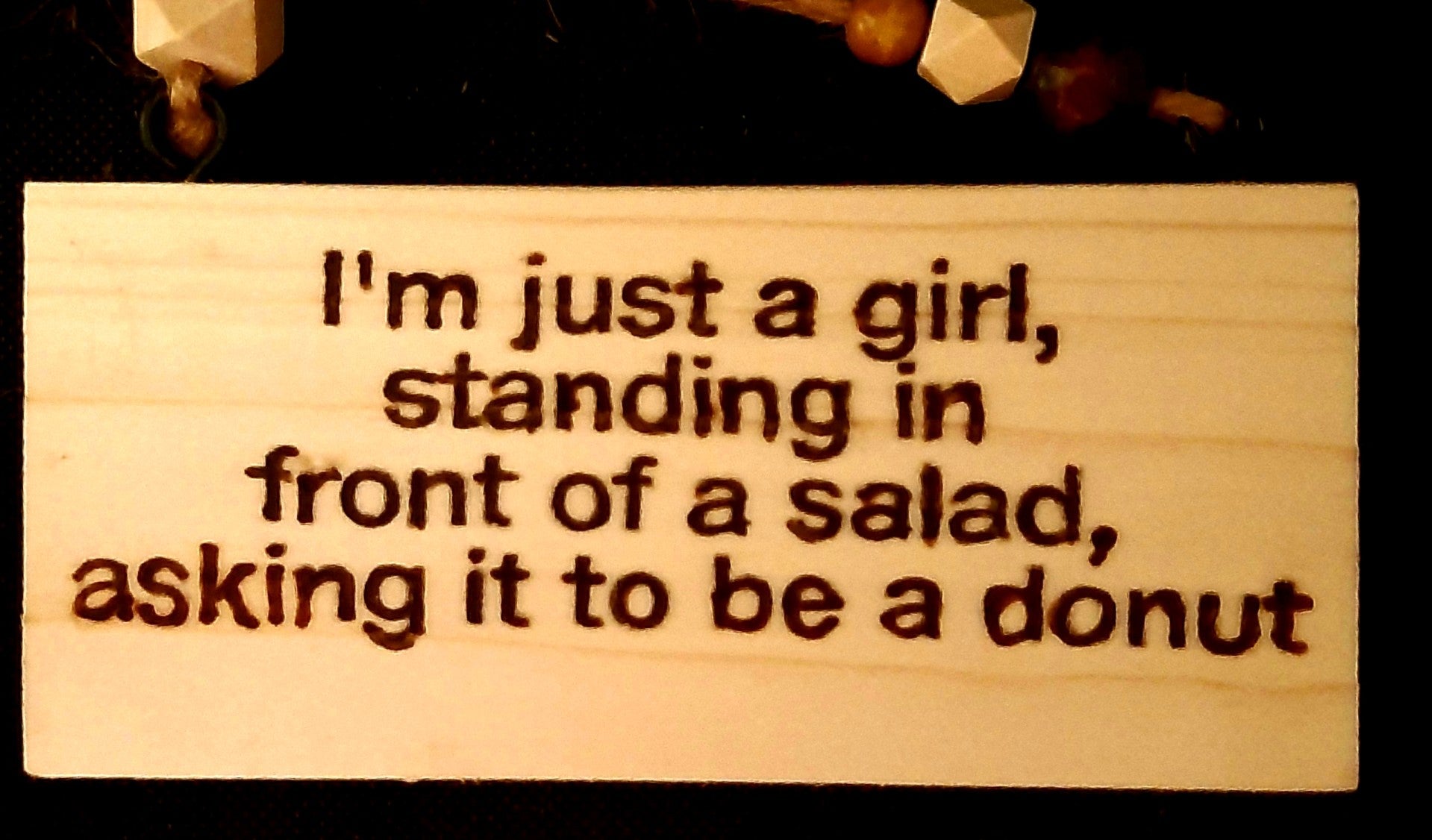 Tekstbordje van hout, waar een toepasselijke tekst is op gebrand. De teksten gaan over voeding of de keuken. Het bordje is op tehangen dmv het ophangtouwtje.