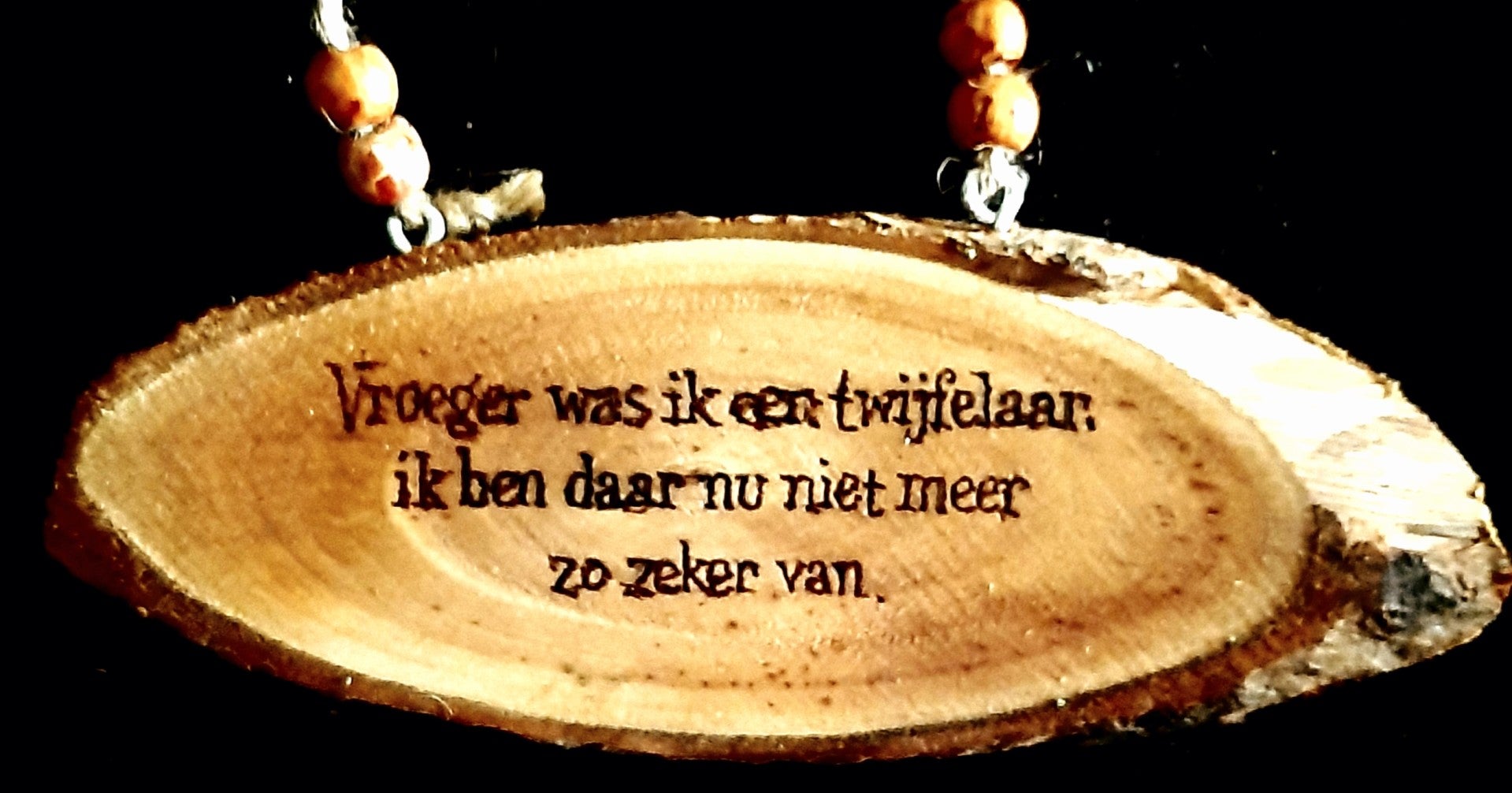 Tekstbord van hout, gebrand op een boomstamschijf, met een grappige tekst erop.