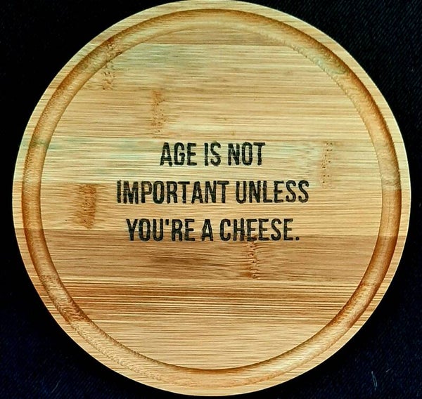 Snij/serveerplank van hout met daarop een toepasselijke tekst gebrand. Dit plankje is uitermate geschikt als kaasplankje. De kunststof stolp wordt meegeleverd.