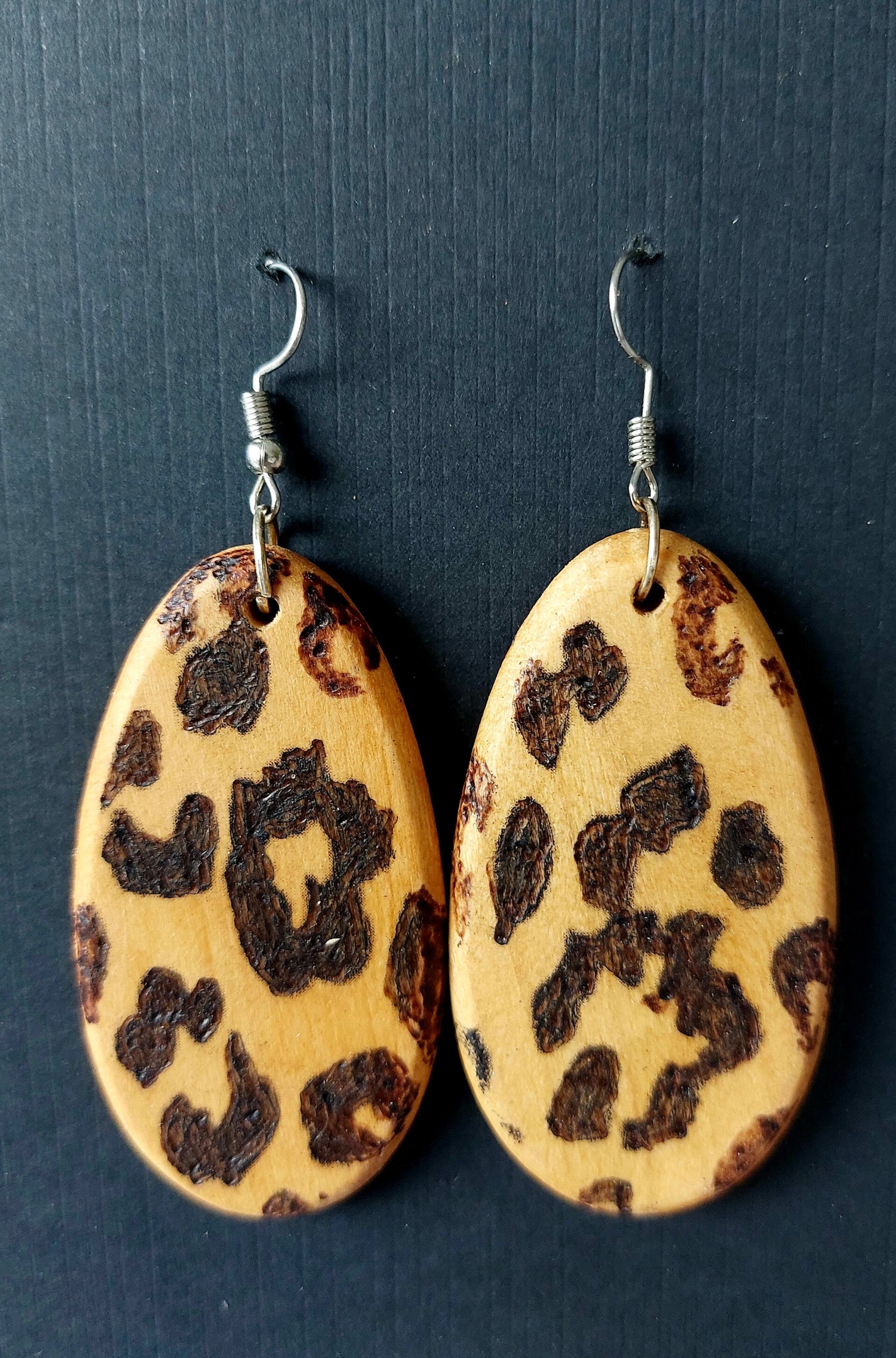 Leuke grote houten oorbellen met daarop een dierenprint gebrand. Afmeting hanger 3 x 6 cm.