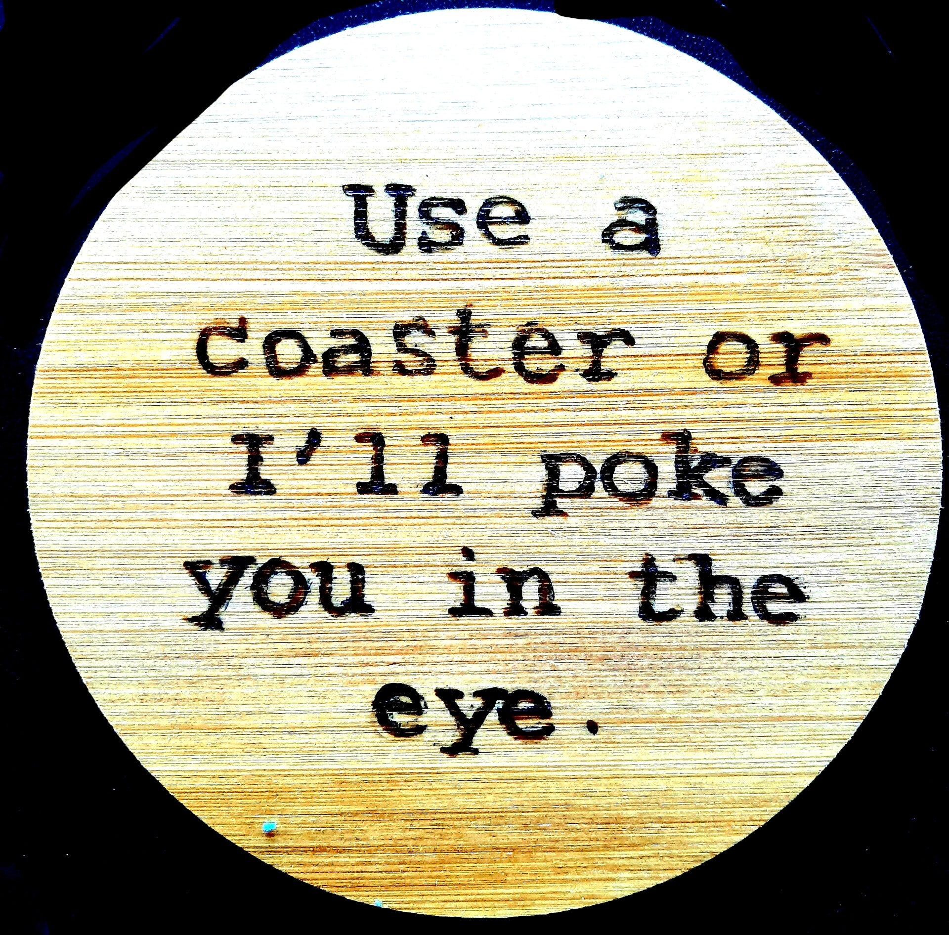 Onderzetter van bamboehout, met daarop een grappige bijpassende tekst en/of afbeelding gebrand.