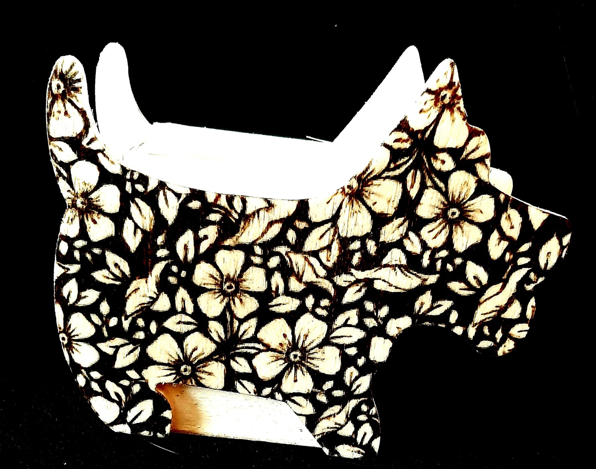 Schattig pennenbakje van hout, in de vorm van een hondje, mer daarop een bloemenpatroon gebrand.