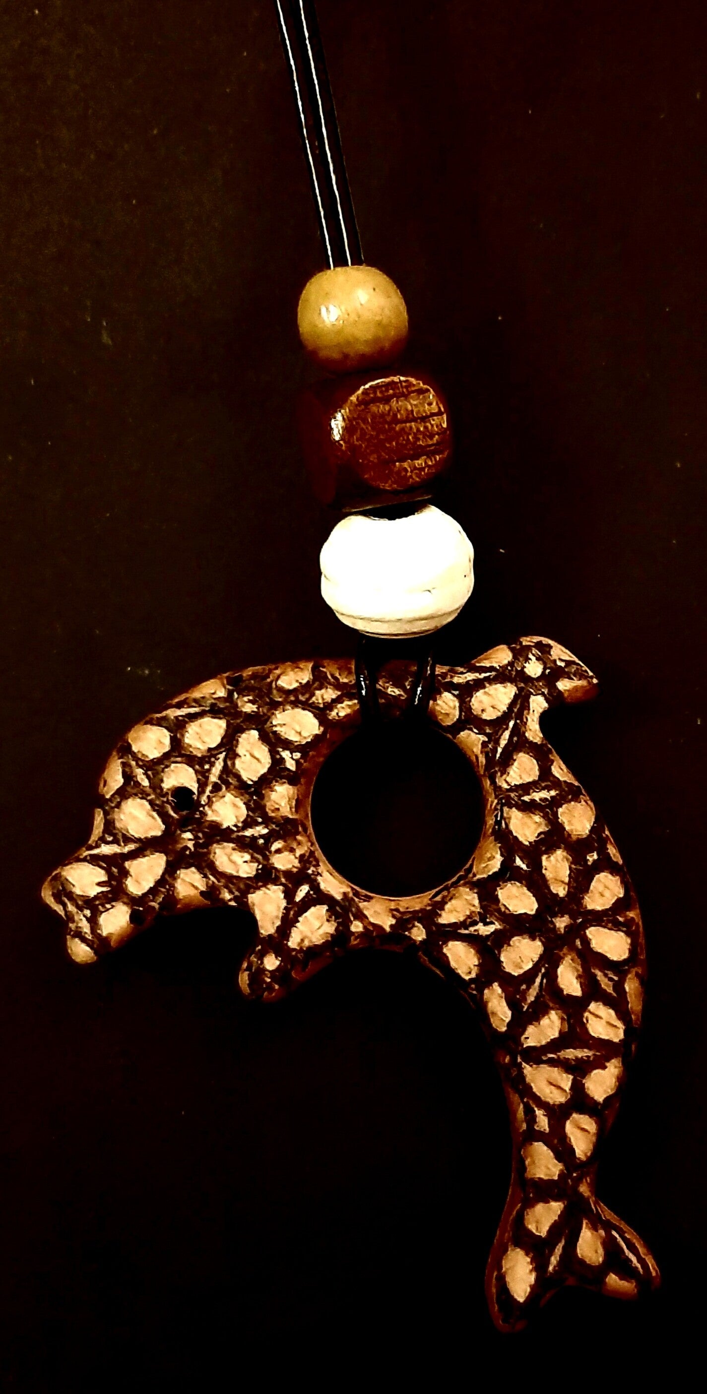 Hanger in de vorm van een dolfijn van hout, met daarop een bloemenpatroon gebrand. De ketting is van bruin lederen koord.