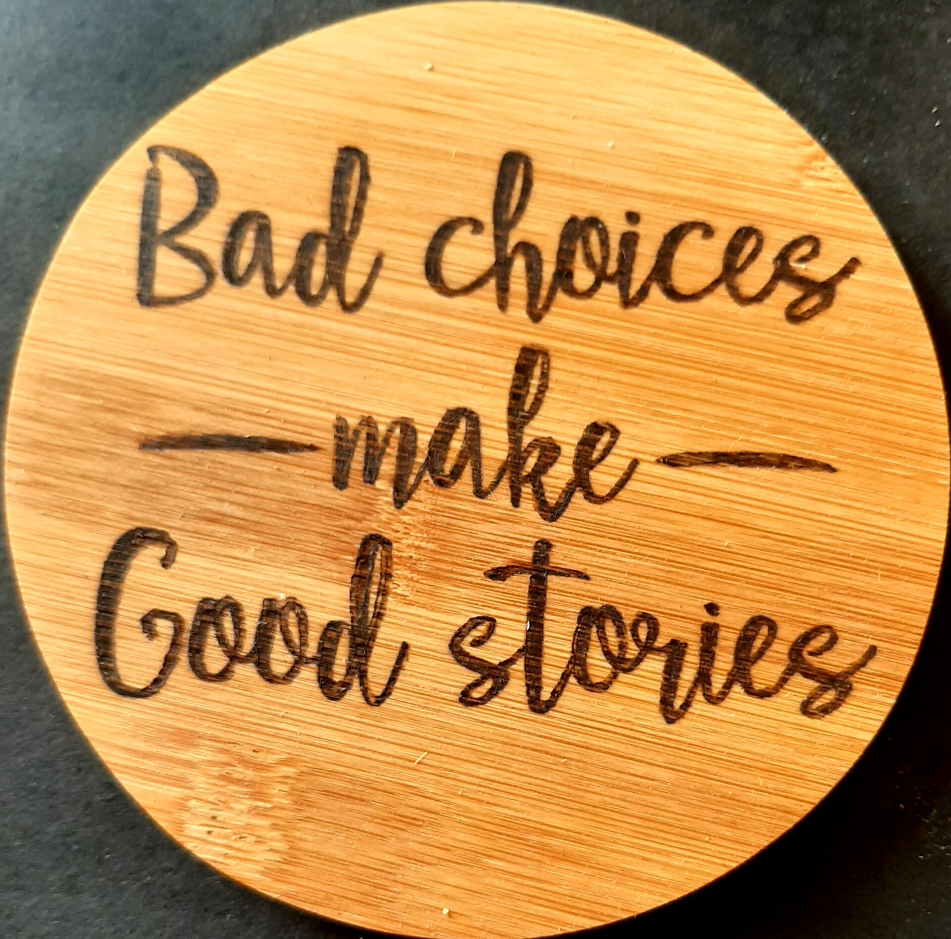 Onderzetter van bamboehout, met daarop een grappige bijpassende tekst en/of afbeelding gebrand.