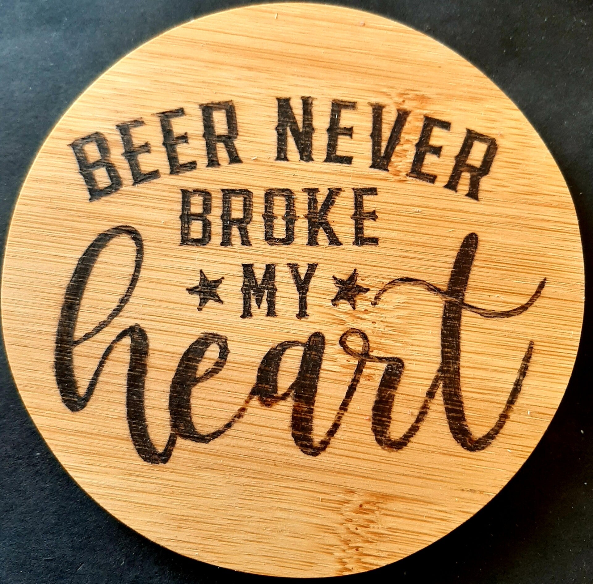 Onderzetter van bamboehout, met daarop een grappige bijpassende tekst en/of afbeelding gebrand.