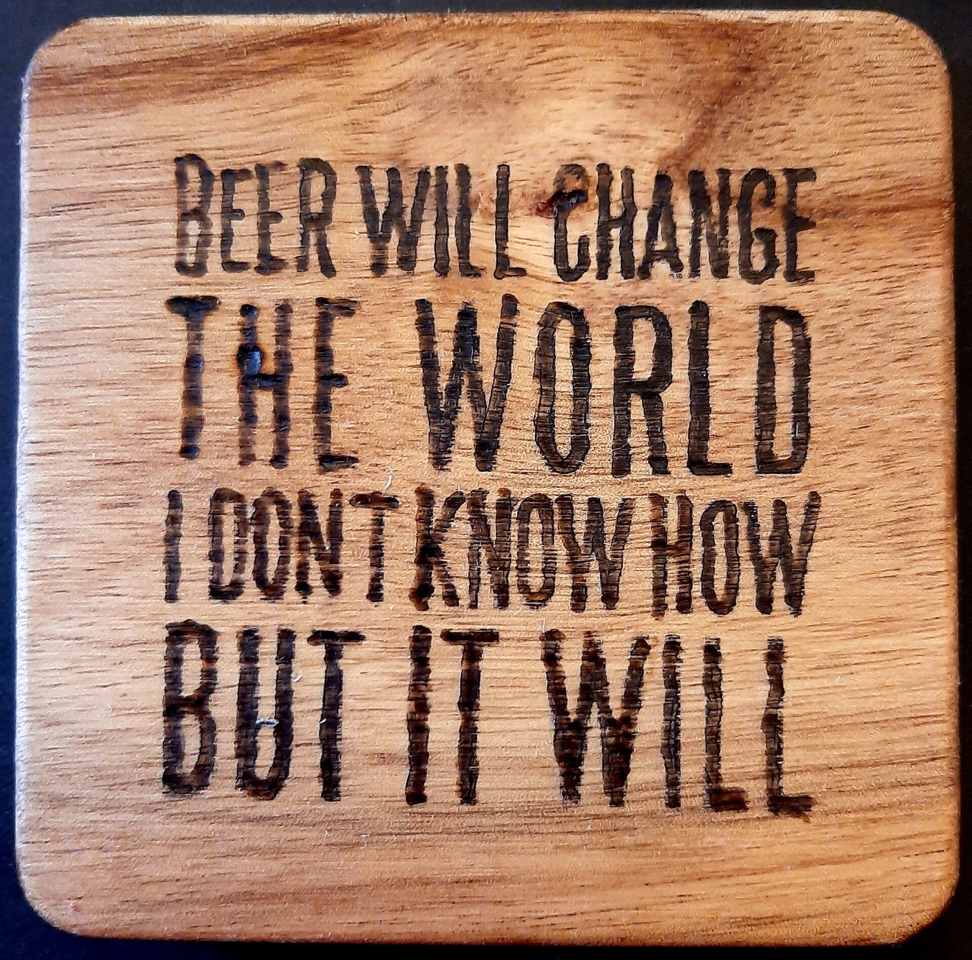 Onderzetter van acacia hout, met daarop een grappige bijpassende tekst en/of afbeelding gebrand.