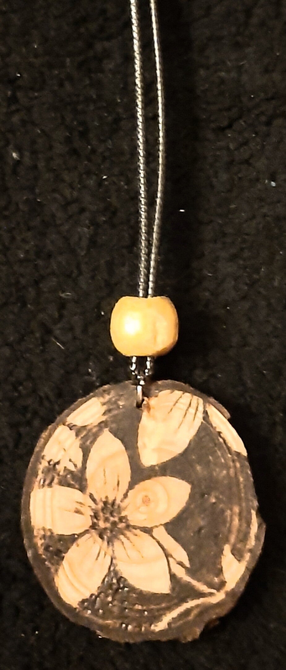 Unieke ketting met een hanger van hout, met daarop een bloemen patroon gebrand. De ketting is een zwart gevlochten lederen koord.