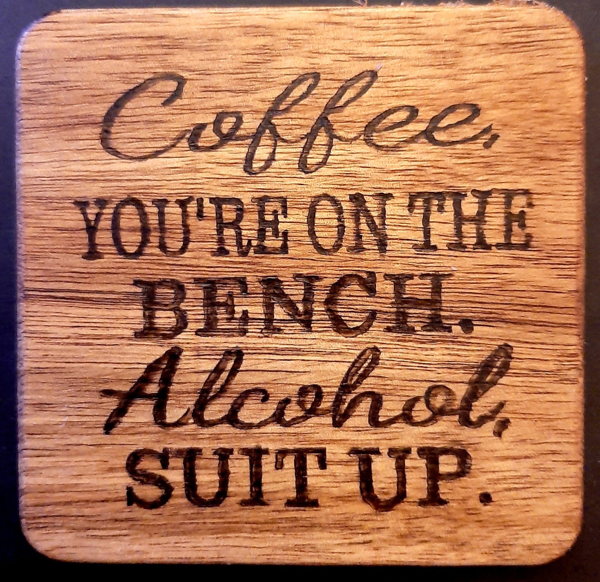 Onderzetter van acacia hout, met daarop een grappige bijpassende tekst en/of afbeelding gebrand.