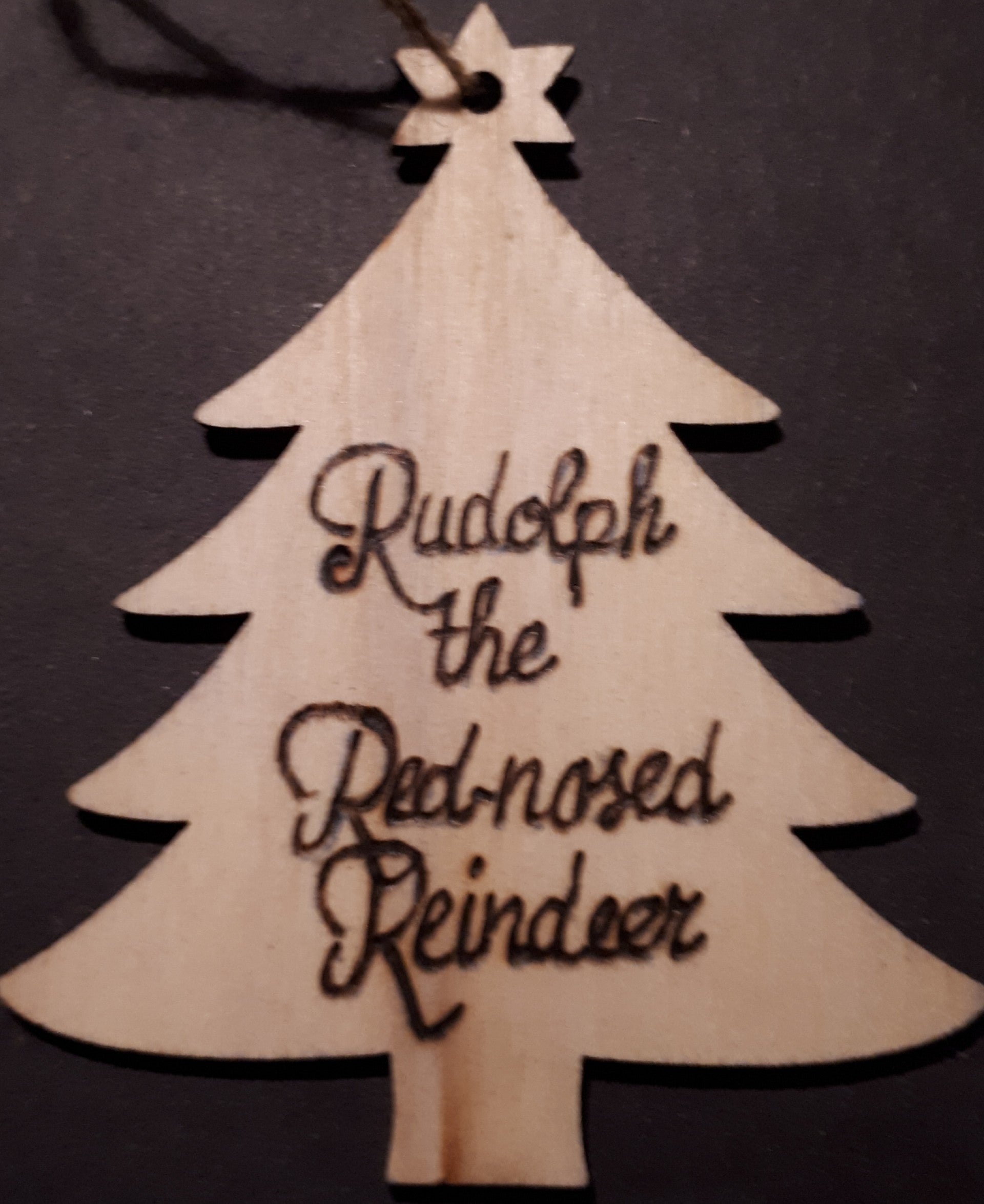 Kadolabel van hout met de tekst Rudolph the red-nosed reindeer.