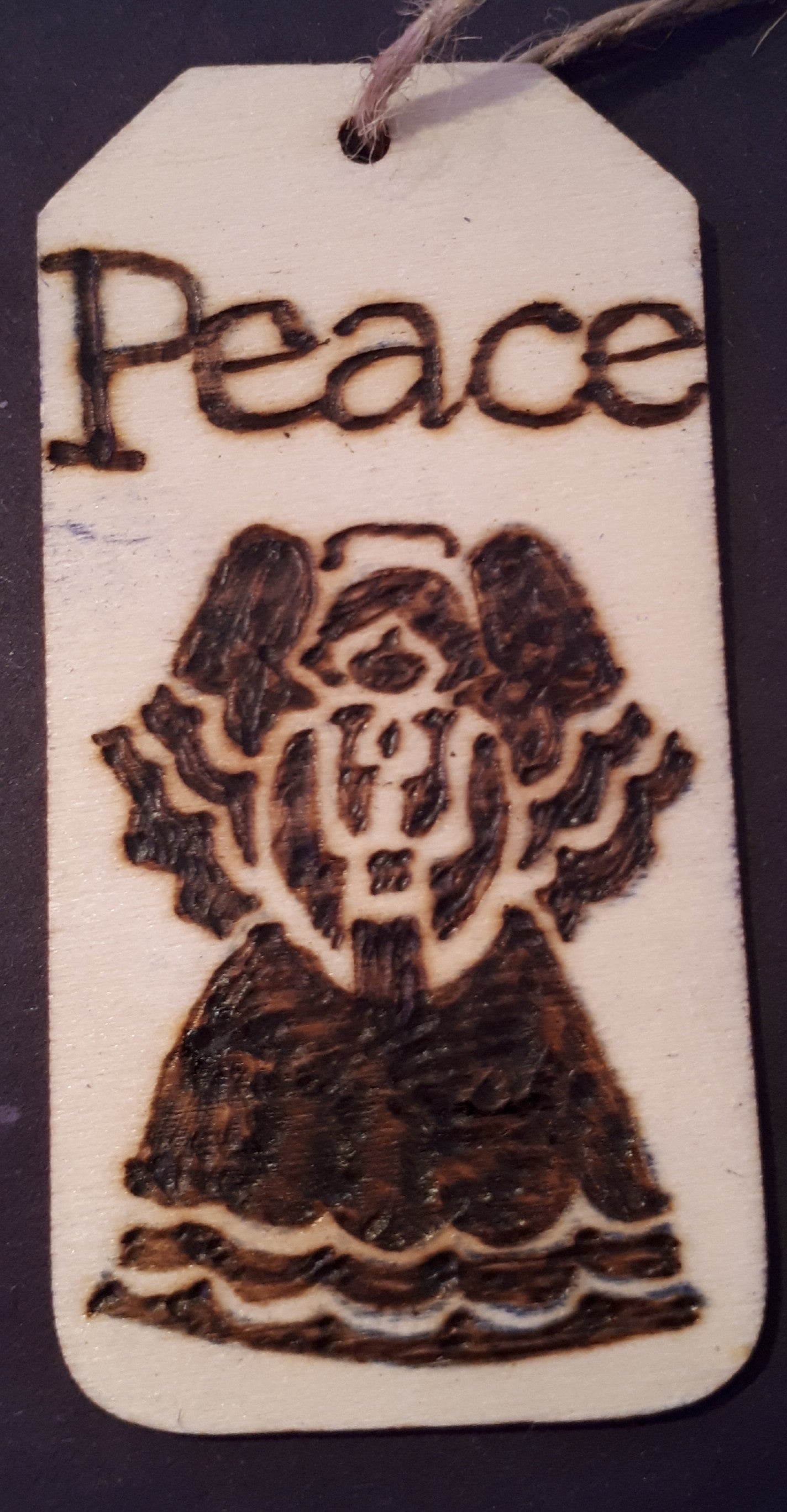 Kadolabel van hout met de tekst peace en een afbeelding van een engel.