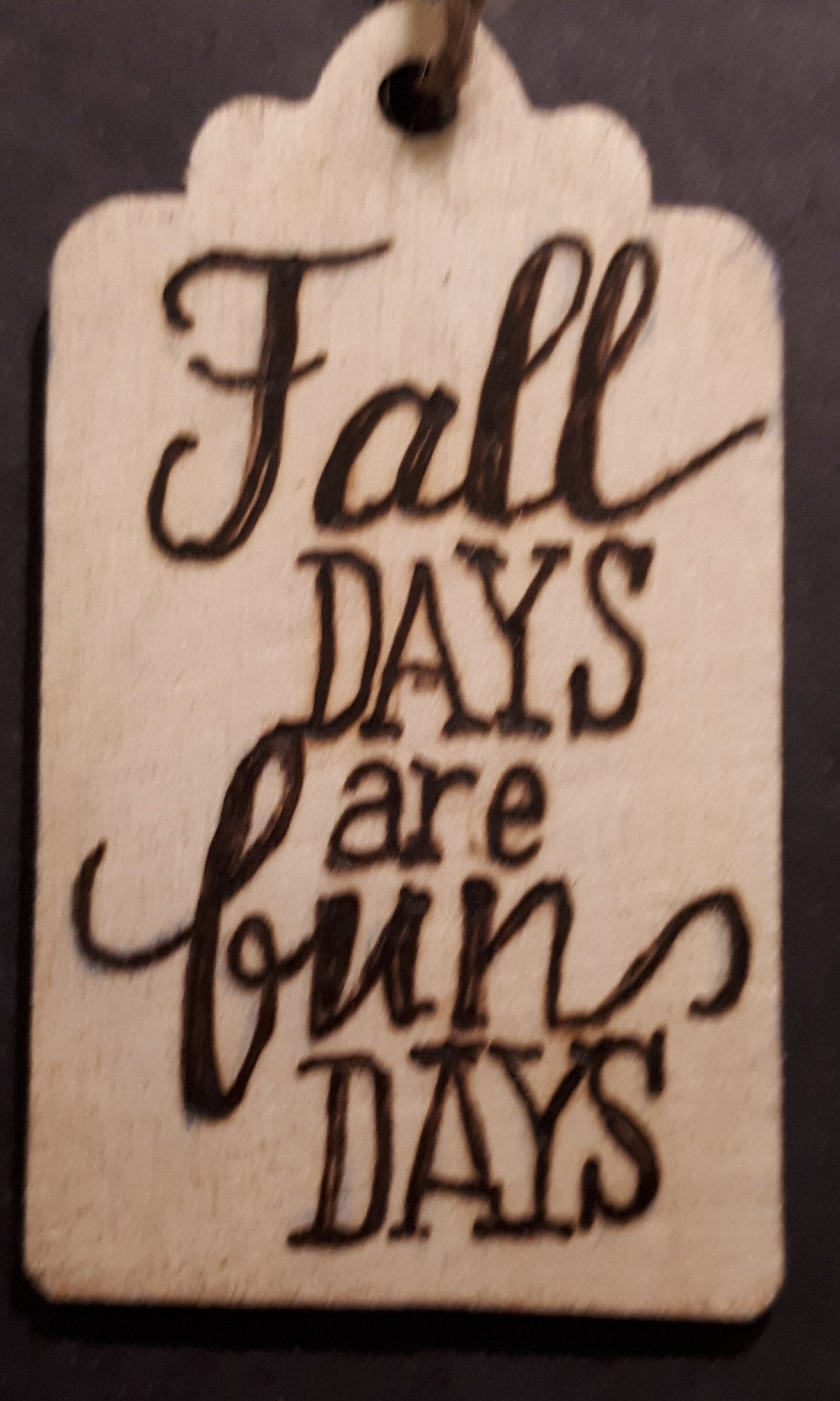 Afmeting ca 3 x 5 cm. Tekst is op het hout gebrand.
