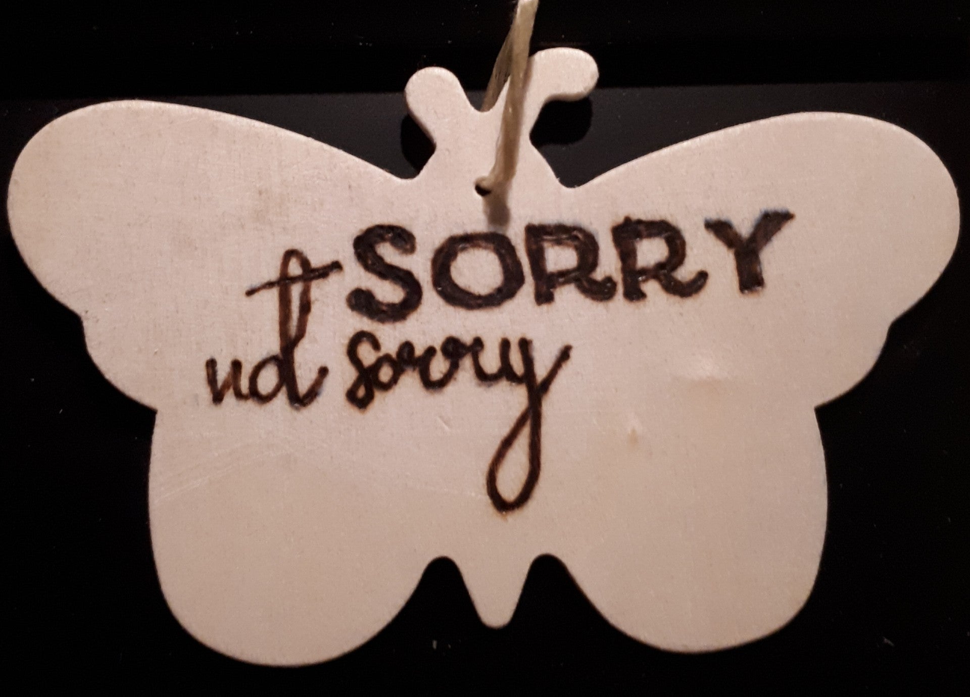 Afmeting ca 6 x 8 cm in vlinder-vorm. Tekst is op het hout gebrand.