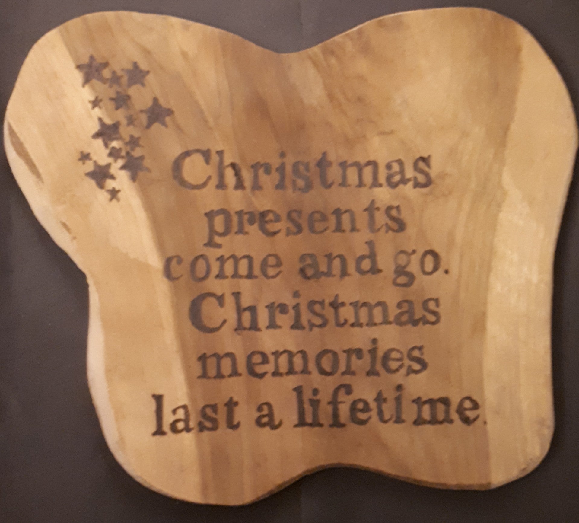Tekstbord, van teakhout, met de tekst Christmas presents come and go. Christmas memories last a lifetime. De tekst is gebrand op het hout.