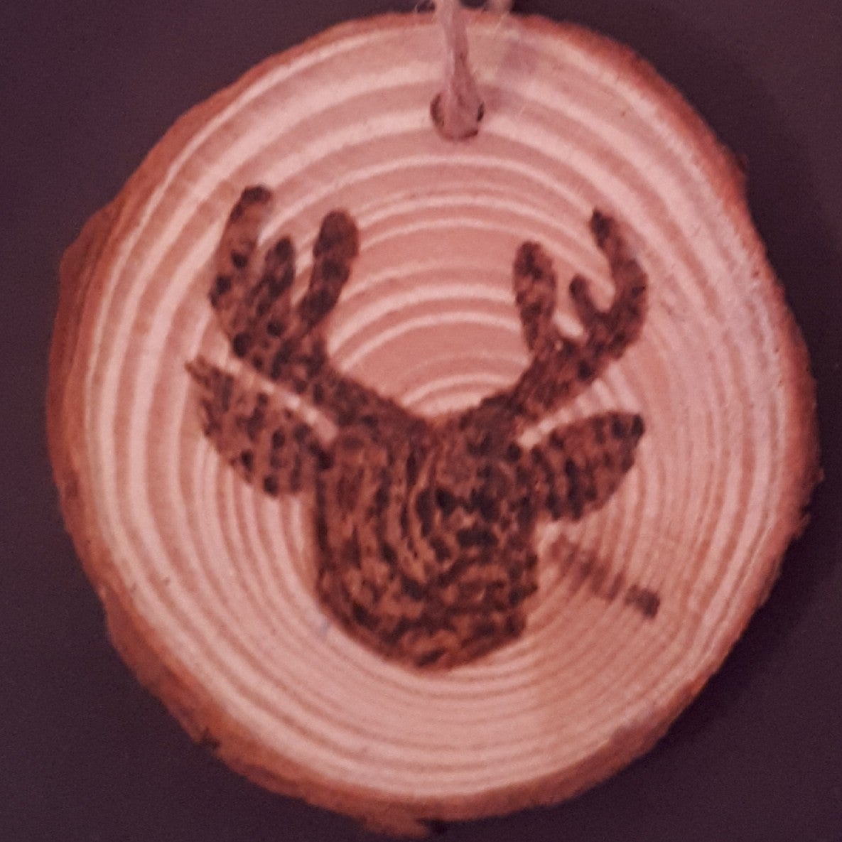 Afmeting ca 5 cm doorsnede. Afbeelding en tekst zijn gebrand op het hout.