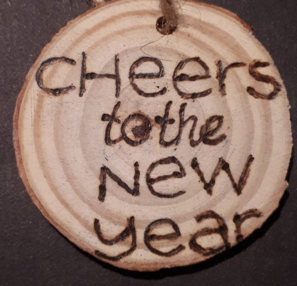 Mini Kerstboomhanger van hout met aan de ene kant een afbeelding van twee glazen en aan de andere kant de bijpassende tekst Cheers to the new year.