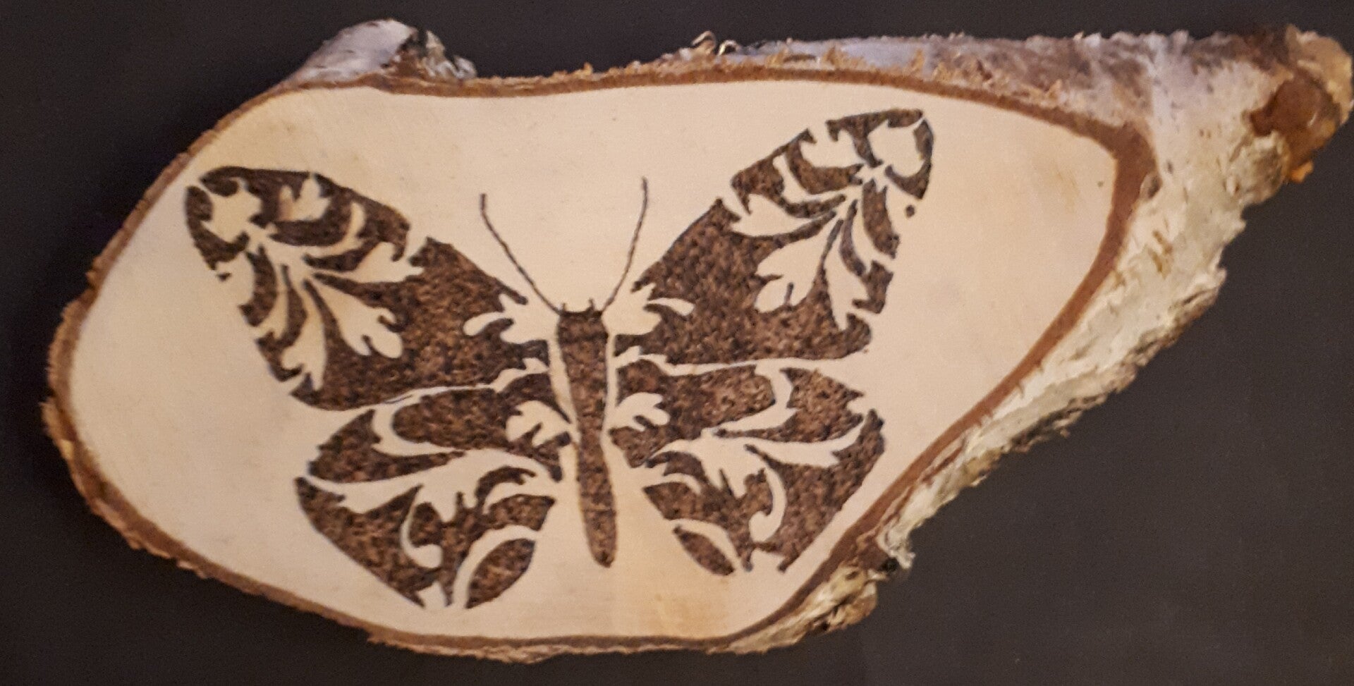 Tekstbord, gemaakt van een boomstamschijf met de afbeeldingvan een vlinder.