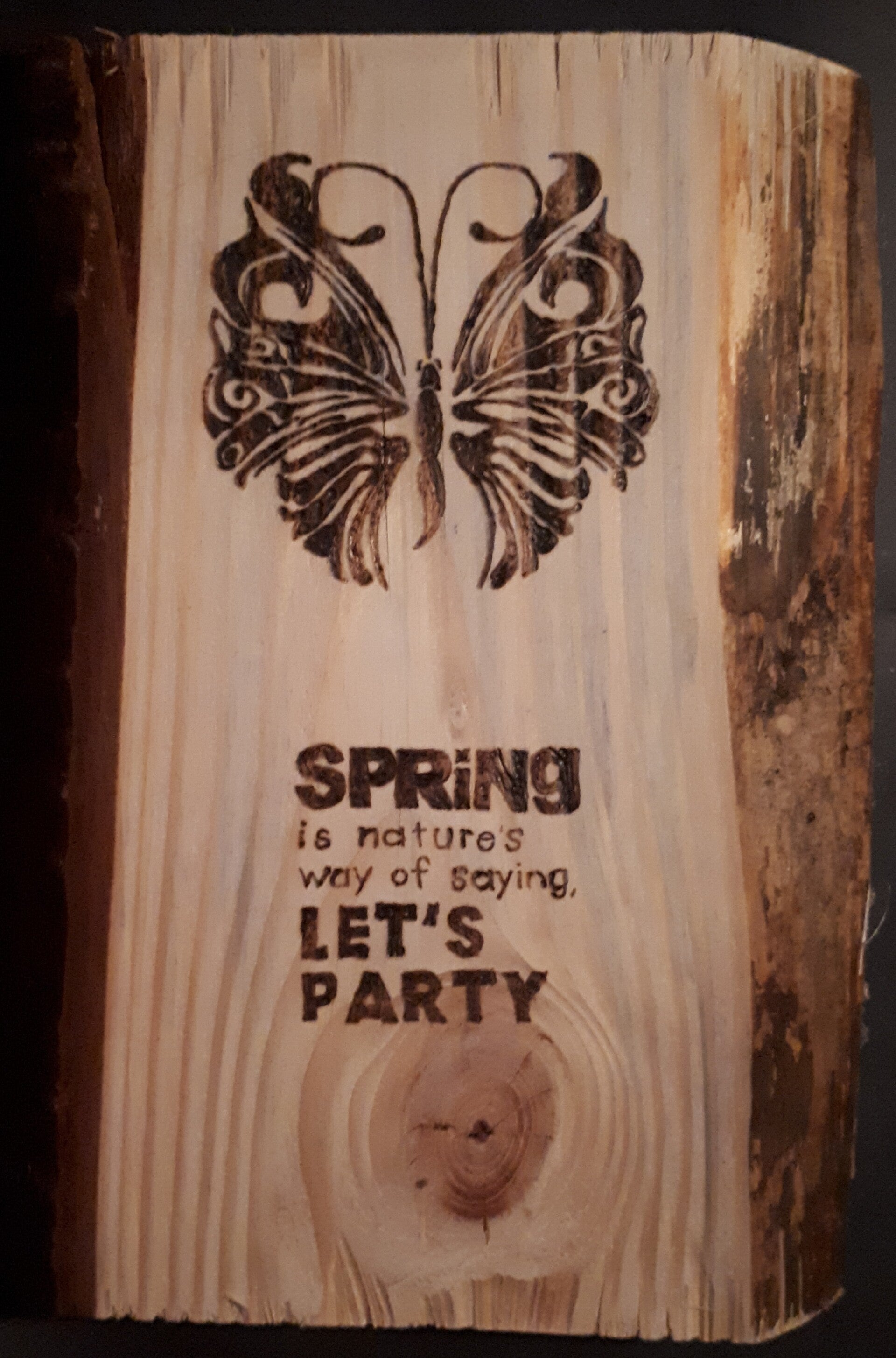 Tekstbord op douglas hout met aan de zijkant boomschors met een afbeelding van een vlinder en de tekst Spring is nature's way of saying let's party.