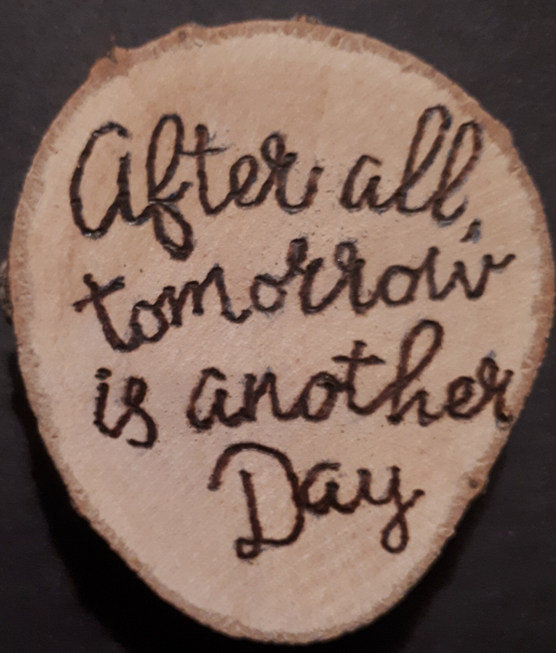Koelkastmagneet van hout met de tekst After all, tomorrow is another day. Aan de achterzijde is een magneet bevestigd.